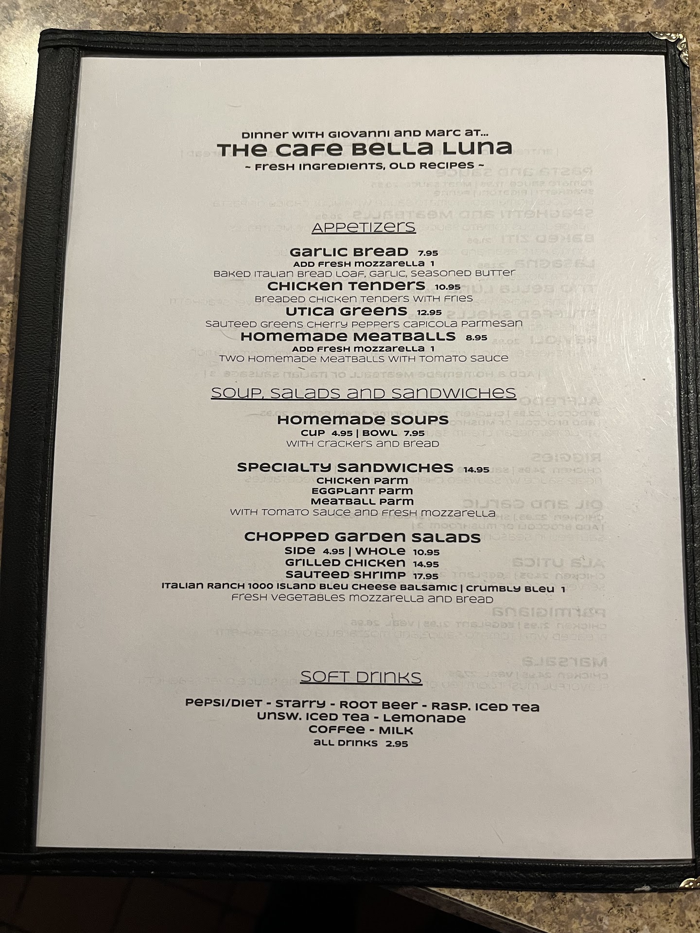 Quite the little find in Brewerton, NY. This little place packs a nice array of delicious homemade Italian dishes. Generous portions of everything from appetizer, soup, salad, entree and canât forget dessert. We started with the Utica greens which were exactly how we like them but with a twist of added pepperoni. Nice touch! Salads were fresh and just the right amount. The wedding soup was also delicious with tons of meatballs. Next we feasted on chicken parm, veal parm, and their own bourbon maple & bacon chicken penne. Everything, I mean everything was served piping hot, as it should be. The maple chicken was very different but was actually very tasty and delicious. The chicken & veal parm were also delicious. So glad the portions allowed me a second meal, so that I can enjoy again! The maple bourbon was also served on a strawberry banana cake for dessert. We also had a brownie with caramel and chocolate chips. They were a nice finish to an enjoyable night out with the family. We were told the desserts change regularly. Well, that alone is worth going back for! The cherry on top is that the prices are reasonable, less than some these days, post COVID. Benissimo Bella Luna! This is a new restaurant in an old spot right on the main drag through Brewerton. Definitely worth the ride from Syracuse for a casual Italian meal. Thanks Mark & Gio! Almost forgot, service was also great but they were not busy at the time, but very friendly nonetheless. We...