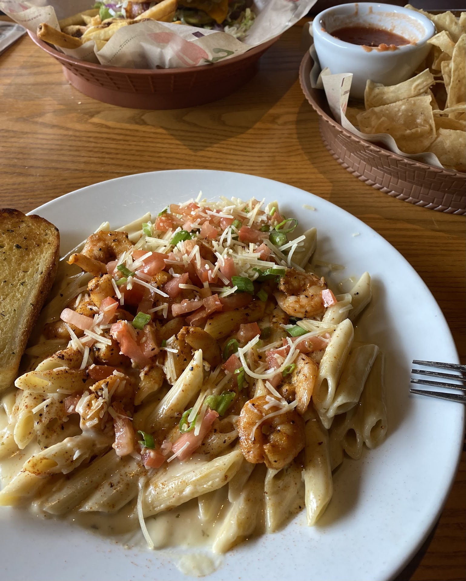 Read moreUsed to eat at Chili’s 🌶️ all the time when I traveled with my cousin for years. Always enjoyed our meals and she loved their Margaritas! Recently stopped in to the only Chili’s restaurant within 60 miles of my new residence. We were seated immediately in the bar area at a high-top table. Chris greeted us pretty quickly and gave us menus even tho he was the only bartender and server taking care of everyone else already seated at the bar and at other tables/booths in the whole bar area!!! He was friendly, professional, and took excellent care of us!! 💯👏🙌 Friend and I ordered the “3 For Me” from the menu. Depending on which beverage, appetizer, and entree you select, will depend on the price you’ll pay for the 3 items. Friend ordered a Coke, the Chicken Enchilada Soup, and the Bacon Burger with Fries. Cost was $14.99 for his 3 options. He very much enjoyed his meal and finished everything. I decided to have a Lemonade, the Chips & Salsa, and chose the Cajun Shrimp Pasta for my entree (see pics). The cost of my 3 items was $16.99. You can’t really mess up Lemonade or Chips & Salsa (unless the chips are stale), which these were not. Everything tasted fresh. I could not eat my Cajun Shrimp Pasta because it was way too spicy. 🥵 (I used to eat it all the time in the past.) I told Chris about it when he brought me a to-go container and the bill. I also asked him for some extra lemon wedges so I could add more lemon juice to my meal to be able to eat it at home later. The juice of 4 lemon wedges really added a nice flavor and took away the extra spiciness. I enjoyed my leftover meal much better at home after I prepared it my way. The restaurant/bar was very busy on a Thursday at 2pm. In the bar area, all the TVs were on and it is a nice place to watch games/sports shows. I gave a 4 ⭐️⭐️⭐️⭐️ rating because there is always room for improvement. If I lived in the area, I would definitely give this Chili’s 🌶️ location...