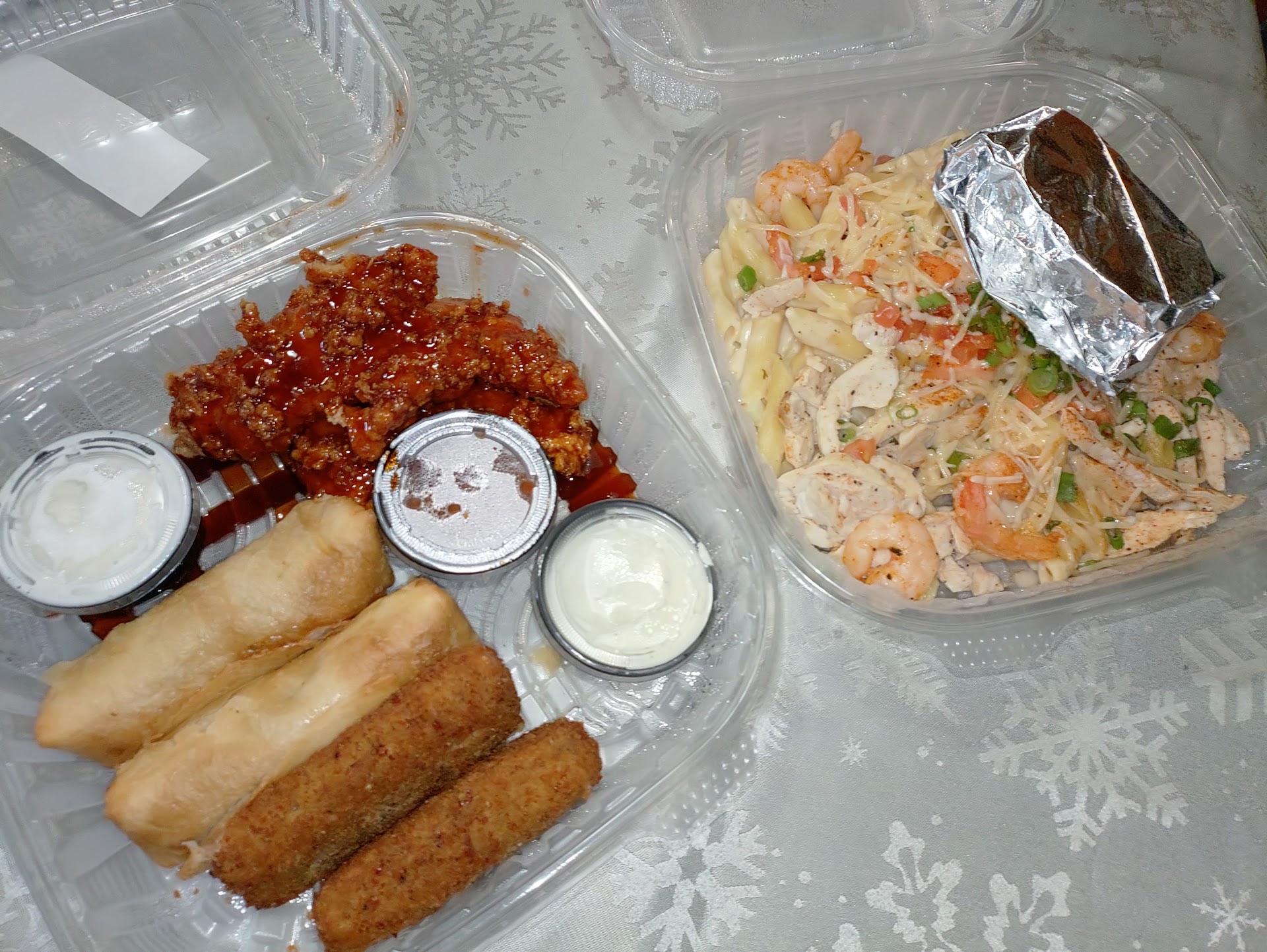 Placed my order online well ahead of time for the Ultimate Cajun Pasta and the Triple Appetizer. (fried mozzarella, southwest egg rolls, and the honey chipotle tenders) Total came to around $43 with tip, which seemed a tad bit steep at the time.