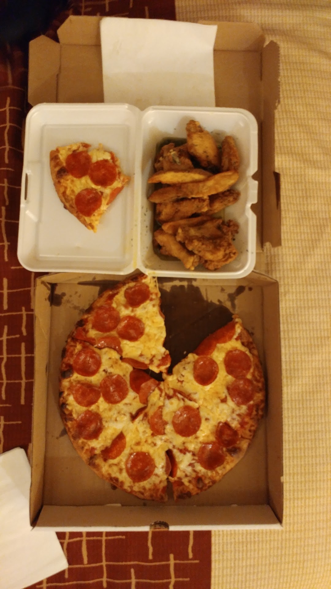 Read moreBefore I start getting chewed out by anyone, Atmosphere is a 1 out of 5. Care to guess why? There is no atmosphere. You order, you get it, you leave. Oh, and it's cash only. No credit cards, no bitcoin, nothing crazy. The whole establishment exists for 1 sole purpose: to provide pizza and pizza type staples one would come to expect from a pizza establishment. For every corner cut to make this place a pickup only establishment, it's for a purpose. That purpose is to provide some of the BEST pizza and some of the BEST hot wings in the area. Their wings, honestly have incredible kick and some outstanding spice to them. The pizza is incredibly balanced with their flavors. Not too sweet on the sauce, not too much garlic, dough is just right. A decent laughing point, though, is their wings. I've never heard of wings and spuds. Ever. It's good, actually. Incredibly good. Great combination. I'd have never thought to put the two together, but that's my own limited imagination. 10/10...