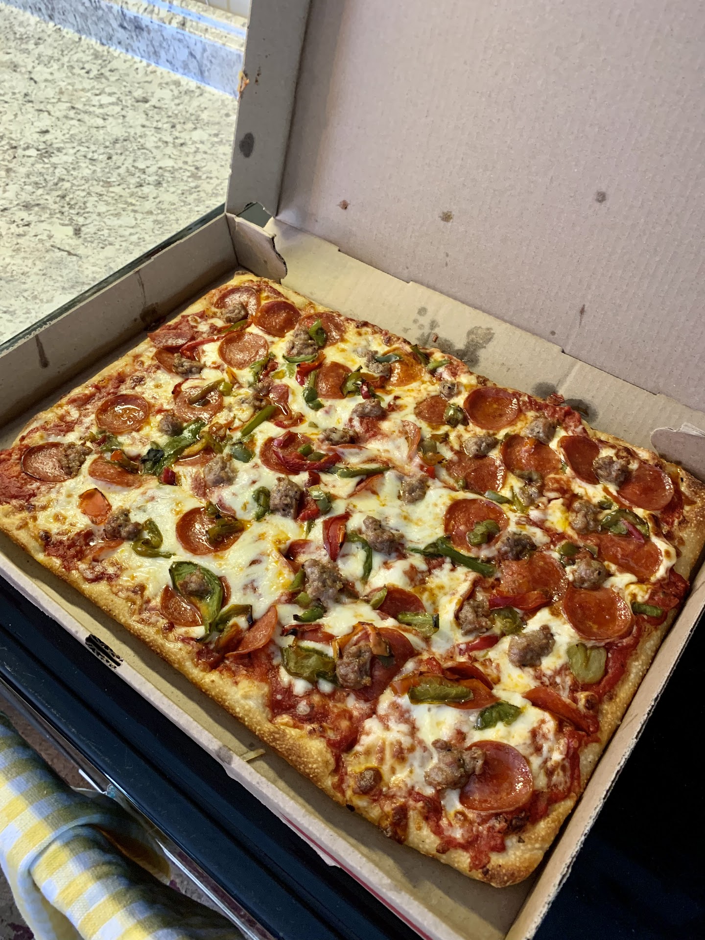 We had ordered 2 pizzas and some wings with spuds. The large pizza is a square pizza and the small pizza was a pretty small round pizza. It was enough for my wife and daughter. My son and I ate the large square pizza and only had 4 pieces left over. Both pizzas were delicious. The pizza has more of a firm browned crust baked well done. It is not the pizza that flops over when you are holding it which is what I usually like. I have to say it was a delicious change from what I am used to eating. Pizza was very flavorful and the wings were awesome. The wings have a seasoning on them which is better than the normal Franks Hot Sauce Wings found at most pizza places now days. They were cooked perfectly and are my new favorite wings. I am glad we gave it a try and we will be going...