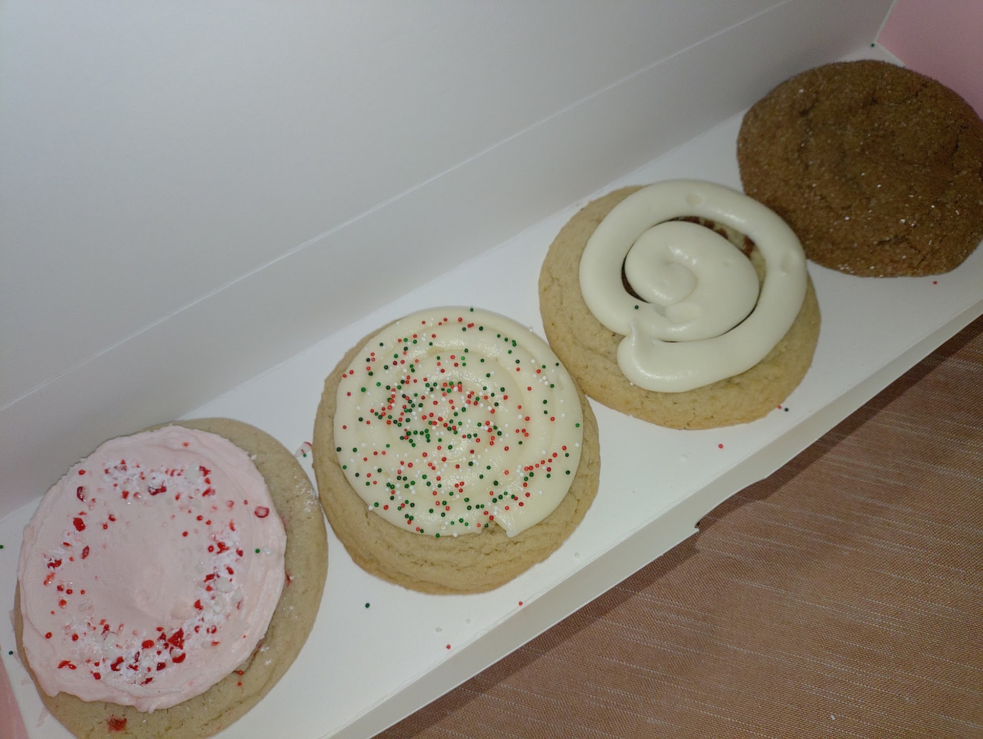 Arrived on site and used their self service stations to order a cinnamon bun cookies, a peppermint cookie, a birthday cake cookie, and a gingersnap cookie. The one thing I totally forgot about the cookies from Crumbl is the fact they are pretty massive, so if you think $15 for a 4 pack is a lot then just know that one Crumbl cookie is about four of those royal dansk cookies.
