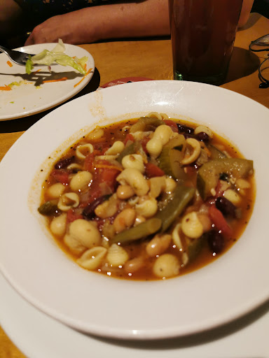 I looked at the menu and decided before I got there that I was going to have the unlimited soup, salad and breadsticks for lunch. Thatās just what we both did. The breadsticks were out first thing and they were delicious. Some of them had more butter on the top, but I went for the ones that had less. It actually seemed like 1/2 of each breadstick was saltier and more butter. I had the minestrone soup and companion had the Toscana. The minestrone is the one vegetarian soup. It was delicious loaded with vegetables and pasta. The salad was for family style, and the waitress. Kindly asked me if we wanted everything on top of it which included onions, olives, croutons Peppers, and not sure what else. It was dressed with Italian dressing and it was delicious. Soup and salad seem to be a perfect lunch and unlike having a lot of pasta or carbohydrates we were able to leave comfortably. We passed on dessert. One thing that I didnāt like was the terminals on each table to pay. I had a gift card as part of the payment and it was very difficult to figure out exactly how to pay. The waitress was extremely kind and helpful. I would absolutely return and probably have the same...