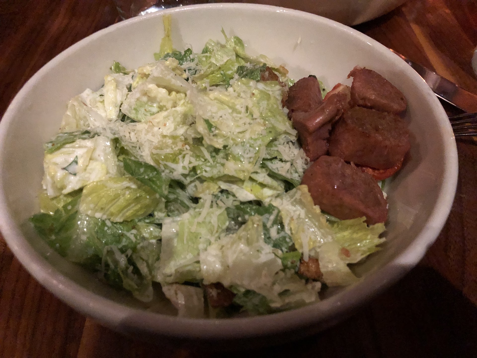 The food. Where do I even begin on the disappointment and sadness? The only good, which I did not even try, was apparently the calamari. The meatballs for an appetizer seemed over seasoned with salt. Not sure if that was from the sauce or the cheese. But it was possibly there to mask the underwhelming, Luke warm balls of protein underneath. Then between appetizers and the main meals, the wait was most definitely NOT worth it. When ordering a full sized salad, you do not expect the half size order to be about the same size. That’s one overcharged meal right there. Then I had ordered sausage crumbles to be added to my meal. One would assume (that’s my fault) that the sausage would be one, some kind of Italian sausage, and it would actually be crumbles. What came out was nothing of the sort. It was sliced, sad, cold, a mushy, unappetizing side of possibly fake sausage. The skin/casing of the sausage didn’t have that typical bite full of resistance. Instead when sampled, it was just down right gross and cold. Now there was an option for plant based sausage, and that’s where I think there might have been a confusion. Whatever it may have been, it left a bad taste in my mouth. At least the waitress took off the charge for the protein.