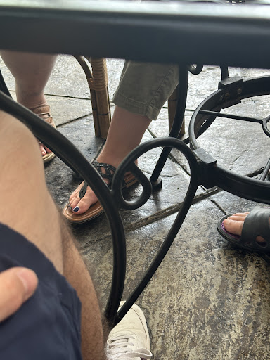 Me and my partner were the first to arrive and after a moment sitting on the patio I had to go to the host stand as the ground at our feet was ultra sticky as if a drink was spilled there and not cleaned up properly. I asked for some wet wipes but instead the host, who was at this point was on his phone in the vestibule, grabbed a spray bottle and rag and half assed it for us. Should have just been mopped.