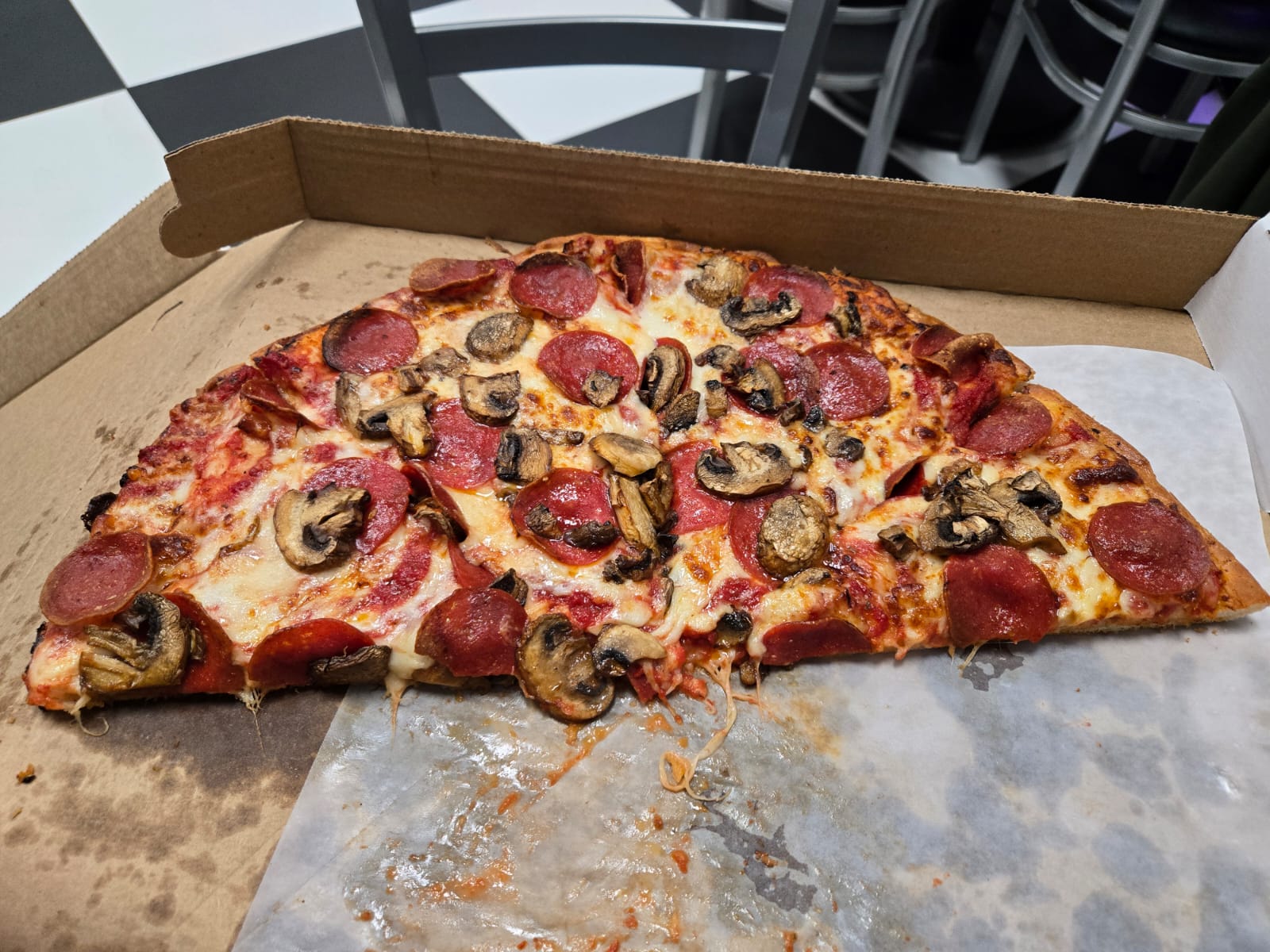 First, slices are substantial. Thick, crunchy and chewy in all the right ways. The girl offered us slices from a fresh pie if we waited but we let it ride. So if slightly old reheated was like this..good sign.