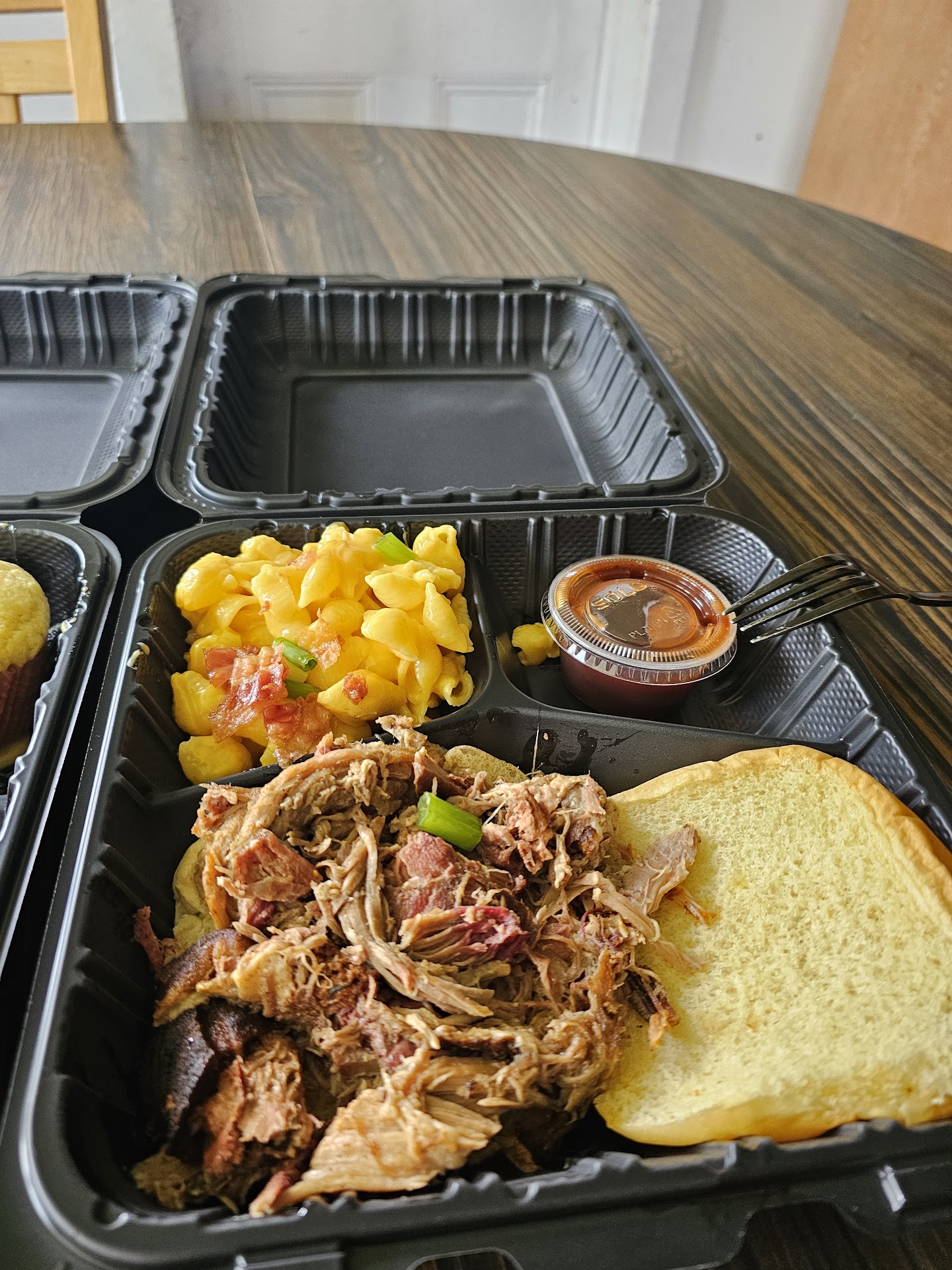 Read moreThis review comes from someone who has been a jury member for several BBQ competitions as well as been featured in a Southern BBQ magazine. The pulled pork BBQ is excellent, flavorful, and had good texture. Very tender and very little fat. There is only one flavor (plain, not spicy) of sauce, but good BBQ does not need sauce and this did not need it). The mac n’ cheese is a family recipe and it was tasty and the green onions and bacon bits were a nice touch. The cornbread was good, but probably does not stack up against cornbread...