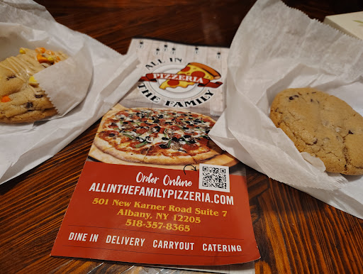 Ā Ā Ā Read moreAll in the Family is an unassuming pizza shop that has a small shop feel to it. There wasnāt much by way of a menu, but there were a several pies by the slice to choose from (2 veggie, 2 chicken, cheese, and pepperoni) and lots of tasty looking cupcakes. I got a slice of veggie which had spinach, broccoli and tomato with what seemed like an olive oil base. The slice surpassed my expectations! The dough was a perfect New York style thin with a little crispiness and chewiness once you got to the crust and blistered just right. It wasnāt soggy at all, which I was impressed with, given all the water that usually seeps out from veggie toppings. Using an oil base was a good choice on that front. Highly recommend if youāre looking for a quick affordable slice! The person at the counter was also friendly and courteous. No picture because it was too...