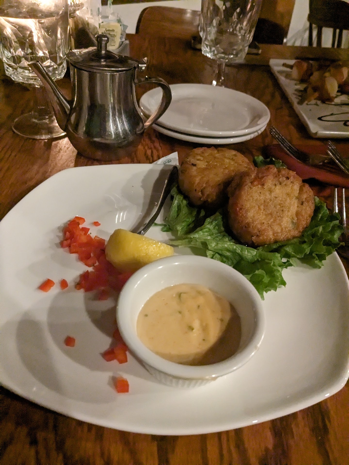 As I have foreshadowed, the food really wasn't good. I got the crab cake appetizer and the cake was very mushy it was like they had put the crab and a ton of bread comes into a mixer and Let It Rock for way too long.. then the cakes were pan-fried and put on my plate with a cup of some sort of a remoulade, a lemon wedge on one of those baby forks and a pile of red peppers that were perfectly cut into tiny squares. This would have been pretty cool if the peppers had been seasoned or some kind of herb or some other flavor had been added to them to make them like a relish, but I found it strange to just have a pile of red peppers on the plate. I ate about half of one crab cake then gave up. My cousin had the Wellington appetizer which she ate the entirety of so I guess it was good. For my meal I got the grilled salmon. It was the wide flat piece that happens at the end of the fillet. The quality of the fish itself was not very good, and it was overcooked, and unseasoned. Perhaps a little salt was on it. I decided to try the center of the fish because I figured that would be less overcooked, and it was, but it was still pretty overdone. No one asked how I would like my fish timer for whatever that's worth.