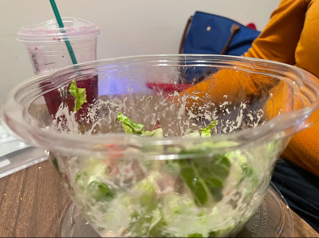 Both Salads were large but came with enough Salad to fill a regular bowl.( I added a picture for reference-where the dressing stops is where the salad up went to) I’m not sure if this is just because the sale is going on or not. I also wonder if that’s why they were skimp on the toppings.