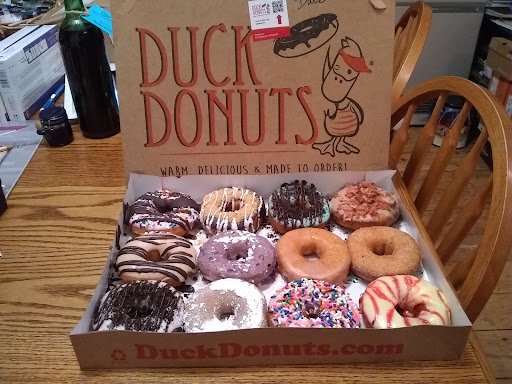 Read moreIf a picture is worth a thousand words, then this one is yelling "Yum! Yum! Yum! Yum! Yum!" about a million times over. Duck donuts is not just an experience for the mouth, it's an experience of the eyes and the senses. When we first walked in, we were greeted by the owner who was working the front and immediately we started smiling as he was making jokes and suggesting donuts for us. As you're looking over the menu board, your senses are inundated with the pictures of the donuts in front of you on the menu and on the boards. As you're choosing your donuts, you can hear the cooks making the donuts off to your side as they shake the sprinkle containers, laugh, and call the name of the person whose order is ready. After picking 14 donuts ranging from a cinnamon sugar to dirt dessert, We walked over and watched the donut artist perform their artistry. Unlike some places whose donuts are a far cry from the photos that you see on the menu board in front of you, let me tell you one thing, these donuts are as pretty as a picture, as you can tell since I took a photo. My family and I love these donuts and this store. They don't only sell donuts. They sell milkshakes, which come highly recommended by two members of my family and breakfast sandwiches which I would eat everyday if I could. They also sell really neat merchandise in which my daughter has two of the ducks and I will have a purple donut guy hanging off the monitor of my computer at work. In conclusion, if you have not tried this wonderful donut place because you think it's only donuts and one donut place is just like the others, you are sadly mistaken. This place is absolutely fantastic and is definitely worth a try because you will be coming back and finding yourself waving at the pink car...