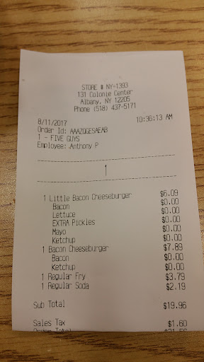 We order from the colonie center mall (Albany NY) we tend to order a lot because we have a big family. Never once have we ever experienced any rude employees, had any issues with the exception of last night. The place was super busy so it was understandable. I want to commend the manager on duty he was extremely apologetic went above and beyond to fix my order that had 1 burger missing and other that was wrong. He is so patient with his employees and never shows his frustration but wants to help them be good at their job. So shout out to this man ... thank you for your patience, understanding and giving extra customer service. This time of year everyone is stressed, busy etc and the world needs more of this! He needs a raise! Remember we're all human screaming and yelling is...