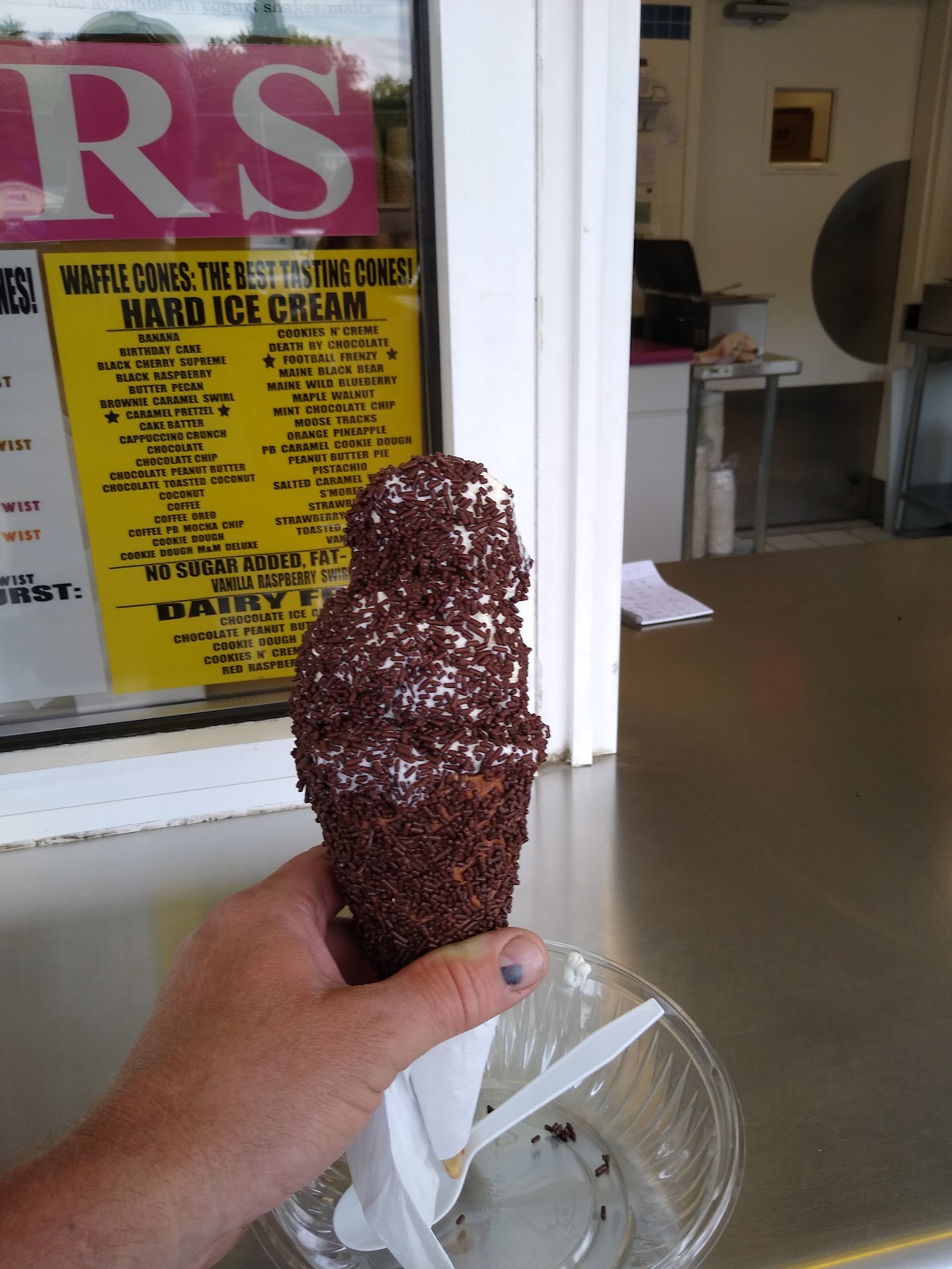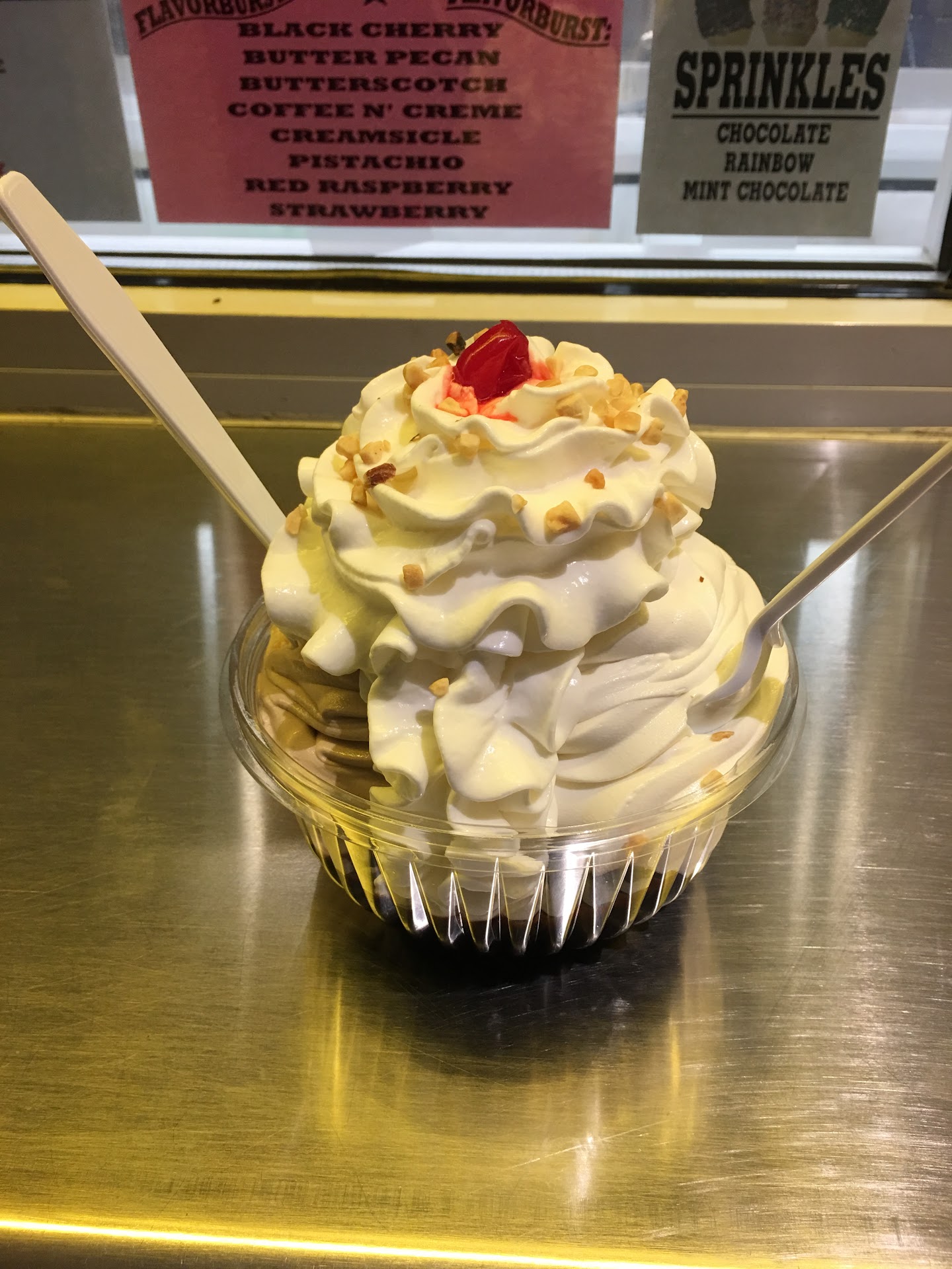 Personally I ordered a large chocolate sprinkled waffle cone with banana hard ice cream with chocolate sprinkles on top.. I was blown away at the size, it was literally like 16" tall!! The server offered a dish to go along with it, which was brilliant.. good call! Five stars all the way!