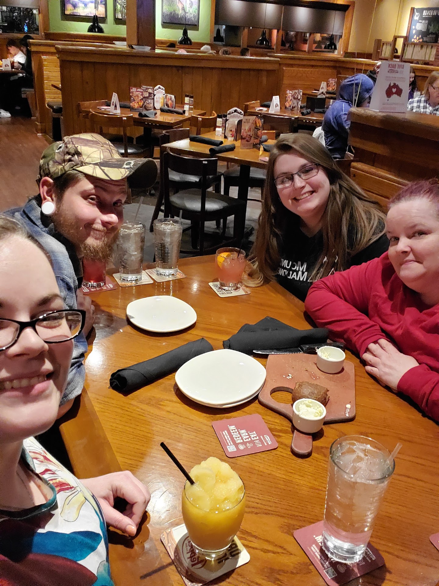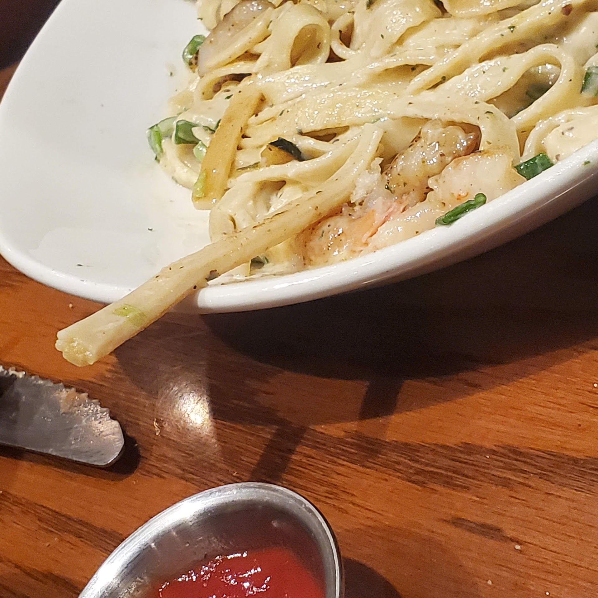 Read moreThere were 5 of us all together. My GF, daughter, grandson, and granddaughter. We were seated right away and almost immediately our server was there asking for drink orders and brought us a small warm loaf of bread and butter. That didnt last long and we asked for another. It was fresh, soft and delicious. The drink orders were varied and a little crazy, but our server got it all down and returned with them rather quickly. My granddaughter and I both had the Kingsland pasta alfredo which had shrimp and steak on top of a bed of linguine with alfredo sauce. My grandson had a cheeseburger and fries. My girlfriend had a ribeye steak with a loaded baked potatoes and seasonal vegetables. My daughter had the chicken Alice with a loaded baked potato. And we started off with the Blooming onion. If you have ever gotten a blooming onion from a fair....these blow them away. First off they are cooked completely through. No raw onion on the bottom and they are sliced all the way as well so you can put out individual blooms. They are the best and the sauce can not be duplicated. The girlfriends steak, and our daughters chicken were cooked to perfection. They were moist juicy and very flavorful. The baked potatoes were as they put it "To die for". The seasonal vegetables needed to be cooked longer in their opinion. They were cold and hard, like they were blanched and not really cooked. I would recommend saying how you want them(hard or soft) and then specifying that you want them hot. I have to do this at many chain restaurants as the veggies always seem to be cold and hard. My grandson ate all of his burger and fries which is unusual. He even commented on how good the fries were. Then we come to the Kingsland alfredo dishes. We had ordered the steak medium which it was more like medium well to well done. It was like chewing on raw hide and no pink in it at all. The shrimp were coated in a cajun spice that was so hot it was worse than eating buffalo chicken wings, and the alfredo noodles were so dry they could have definitely used some more sauce and or maybe some shredded cheese to give it more flavor. I ended up bringing it home and doctoring it up for my granddaughter and I. It wasn't a complete flop great service by the server and over half the meal was 150% as well as the ladies enjoyed their drinks very much. If the Kingsland meals had been a little better(meat pink and tender and shrimp not as spicy) it would have been a 100/100 meal. We will be back. Thank you for a good enjoyable...