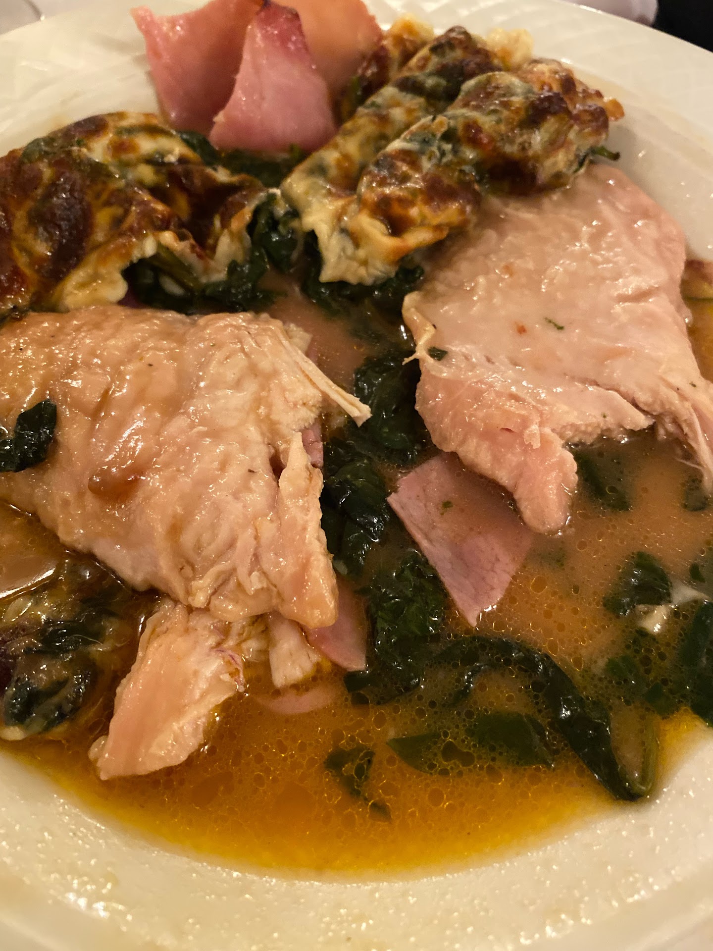 We started out with a glass of wine each. Shared the appetizer of bruschetta which was absolutely delicious and very tasty. Then we had the house salad that accompanies the dinner. I had the veal chop which was a good size with pasta on the side. It was the best veal chop I have ever eaten. It was perfectly seasoned and cooked. My partner had the salmon which was a generous portion. It was cooked perfectly and it came with spinach and pasta. One of our friends had the eggplant rollatini which was a generous portion over pasta. Too much to eat for one sitting. Our other friend had the Shrimp Alla Vanessa which is a house specialty consisting of pan seared shrimp sautéed with spinach garlic, olive oil and white wine and served over pasta. The entrees were very generous and no one had room for dessert.