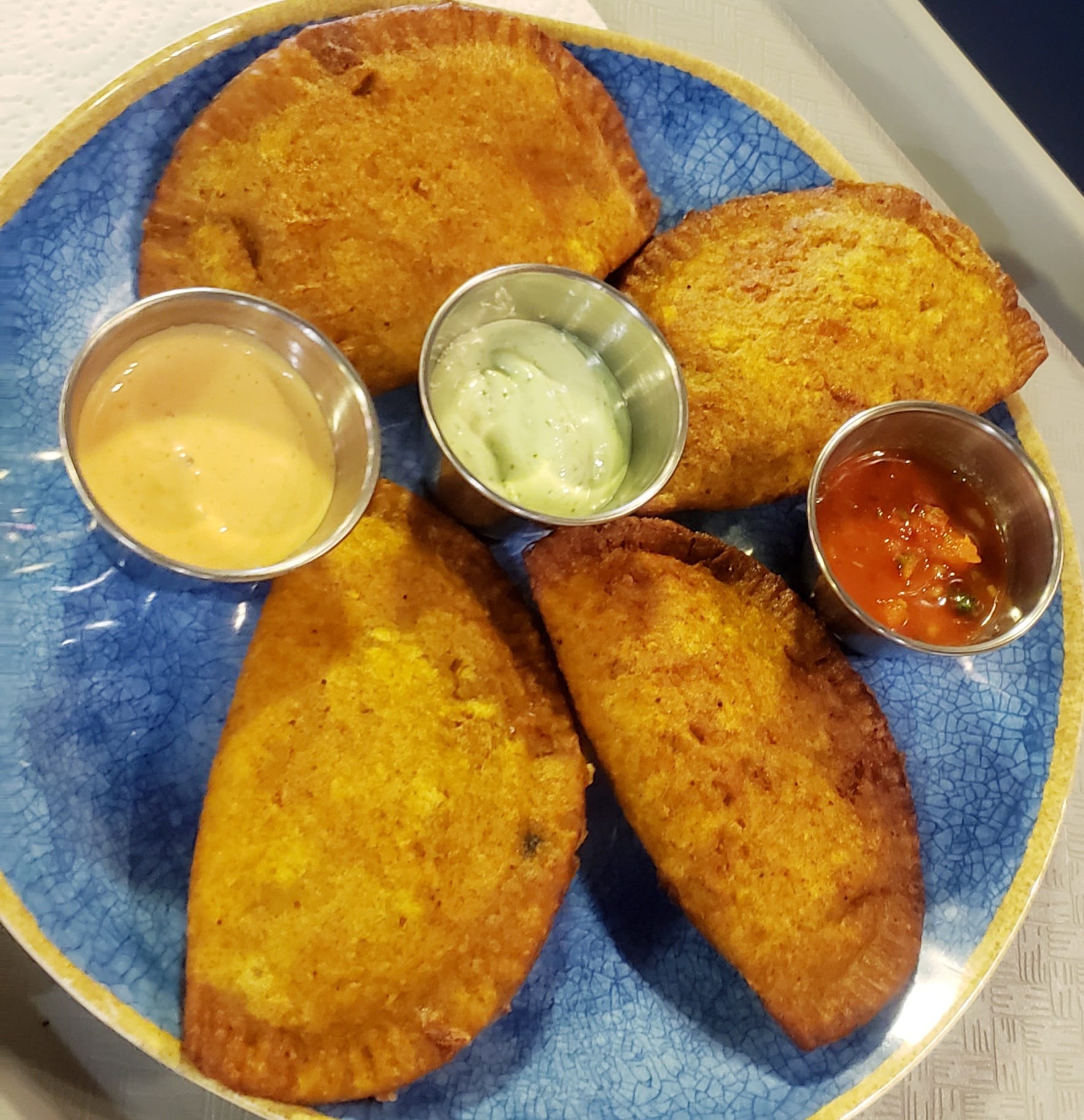 Each empanada came with sauces as well. I had gotten the spicy pico, cilantro avocado, and chimichurri. The spicy pico had nice chunks of onion and tomato, and the cilantro avocado was subtle and tangy. The chimichurri was very well balanced as well.