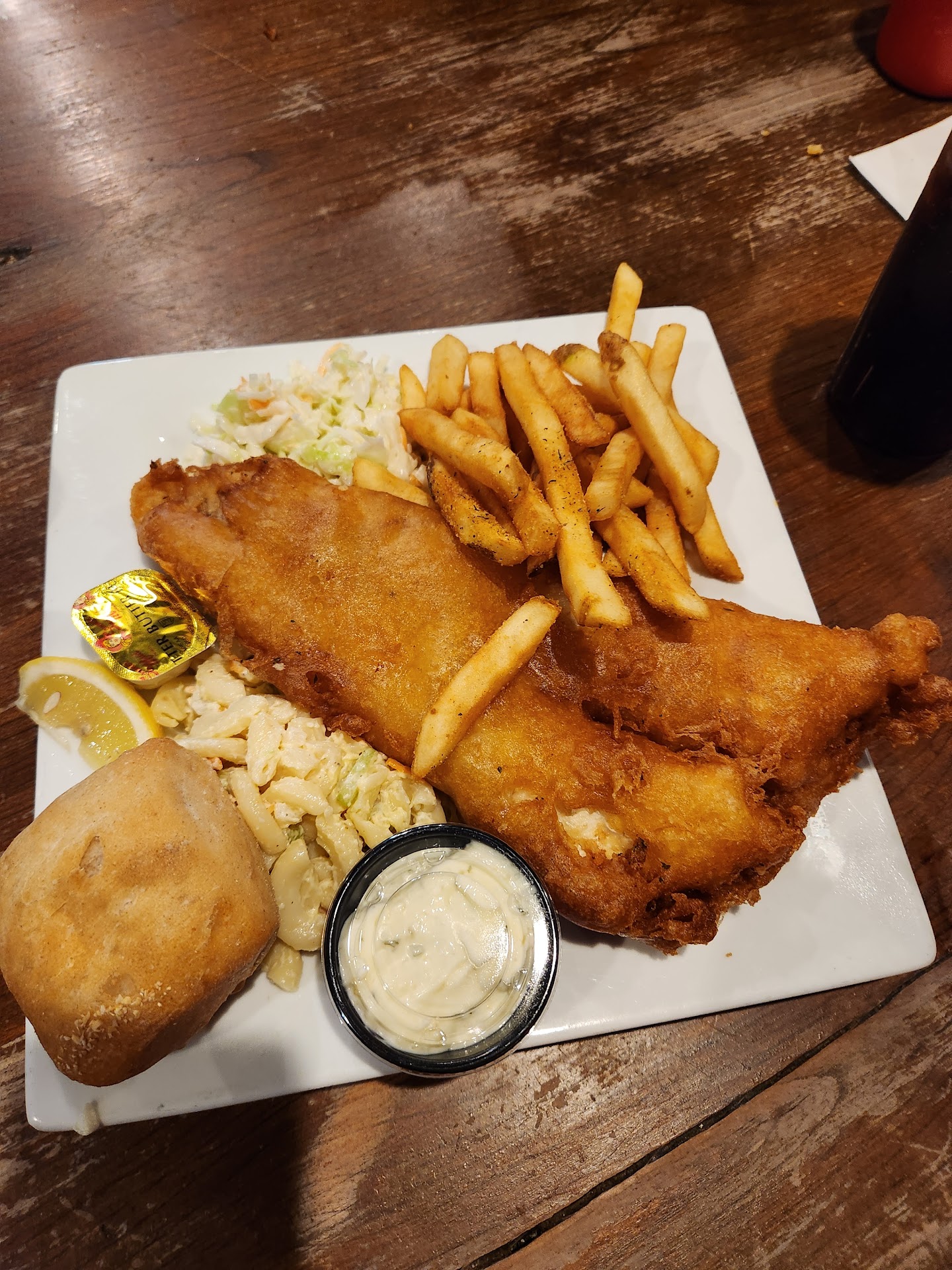I had the battered fish fry which was delicious. The fries were delicious Mex sell. It was delicious. Coleslaw was nasty. All you tasted was vinegar. My cousin had tater tots and fries gravy and their cheese. He didn't like the cheese but I love the cheese. It was delicious when we were ready to go I asked for so I can take it home. They gave me the stuff, put it in there. Then I asked for a bag. We have no bags. She says right there is a downfall. I had to go to the car and go get me a bag just to bring my stuff home. That's ridiculous. They should have base for people they atmosphere. I don't know it's a restaurant for that one. JD, it was okay. It's a bar and a restaurant so I could just say it's okay. The parking was good for me for handicap. Nice person that seats you and the waitress. I had to go get her just to get something to drink or I had to get her for a so I can put our food in our stuff. They don't come to you right away or check on you too often. That's another downfall for me. It was very loud inside everybody was talking. It was probably because of the bar over there on the side but it was too loud for me. You couldn't even hear the music. So why do you have music if you can't hear it inside was very clean. Tables and chairs were clean and yes I would go back in there for a fish fry because it is really cheap. It is only 14.99 and...