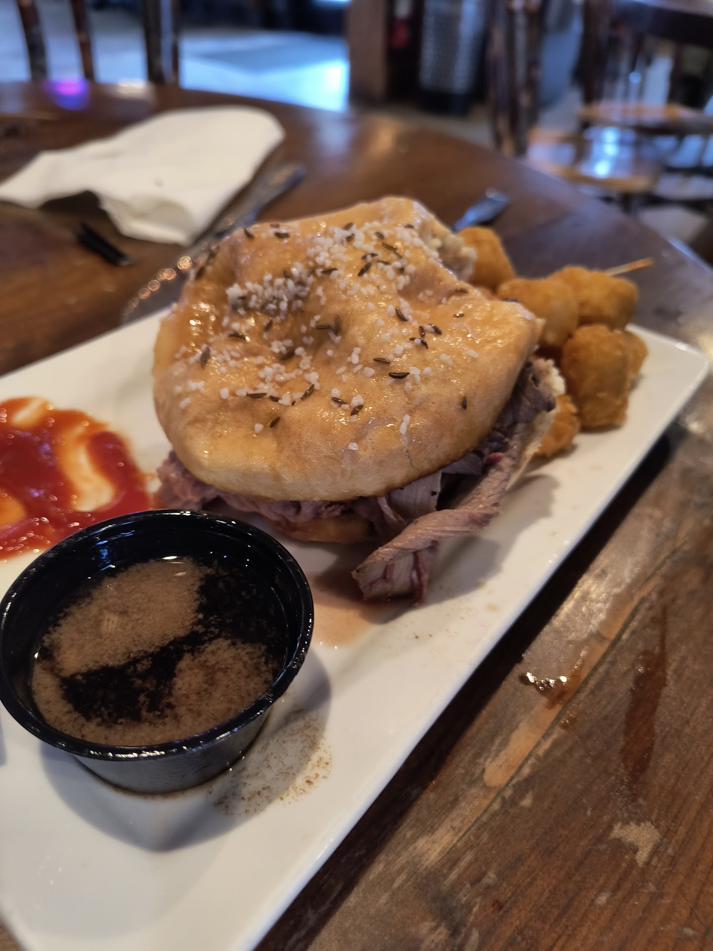 The wait staff were tremendously accommodating towards finding a lower lit area for my husband's comfort. They were also very attentive to my unfortunately long list of allergies.