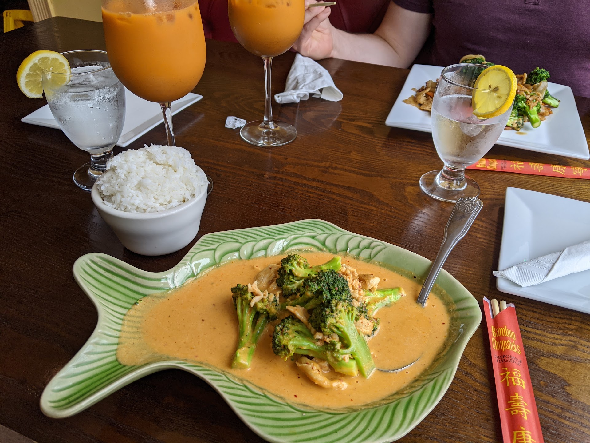 Read moreMy friend and I went on a 4hr hike and upon learning I've never had Thai, they had to take me to get some. We went here, it's a nice small spot, very homey area. The server attended up right away and brought us water, he patiently waited for me to place my order. Their Thai iced tea was amazing, I loved it and highly recommend it. For appetizers, we ordered the fresh summer rolls & Thai spicy chicken wings (they're not very spicy for people who can't take heat) & one friend ordered the Tom Yum soup as appetizer. I ordered the Praram Long Song w/ chicken, in the stir-fry section of the entrées. It was very good, though a new experience for me since I'm used to dinner being a salty meal and this was more of a sweet dinner, it was a very good different. One of my friends ordered Pad Thai noodles w/ chicken & the other Pad Thai noodles w/ beef. They didn't have the fried ice cream but it is fine because we were all full. Very nice place, very clean....