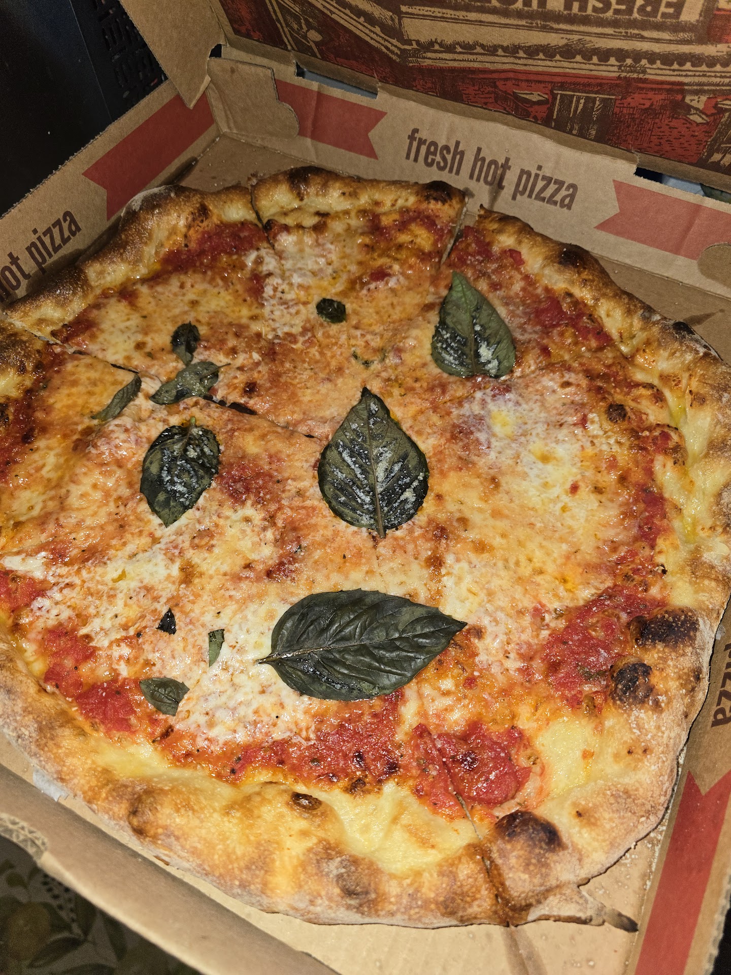 Take even just their standard New York style pie. You don't just get low moisture mozzerella, you get fresh mozzarella, basil, Alta Cucina tomatoes, and shaved parmigiana reggiano on it. The Avenue J, my favorite, you get the works: San Marzano tomatoes, basil, grana padano, olive oil, fresh mozzarella, low moisture mozzerella, on an aerated crispy charred crust.