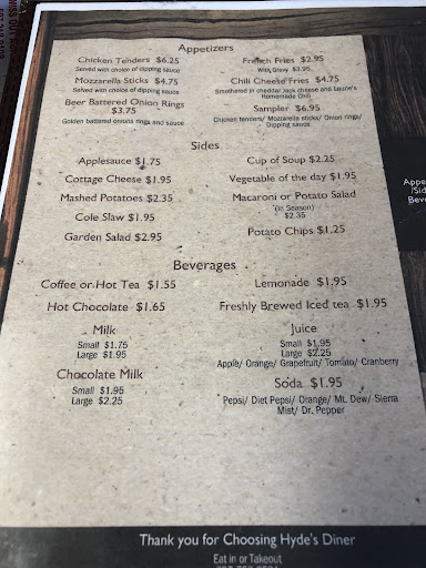 Read moreToday was the worst time I ever had at Hyde's Diner. The waitress was stone off her mind or something. She could talk. She never came for 10-20 mins to take our order and she messed up the order. We still had to pay for the whole thing. My BF didn't even eat his bc . It was the wrong order. The whole time the waitress ignores us . She got the people drinks and food way before us when we where there 15 mins before then. I wanted another drink but couldn't .. never going there again. The worst time ever. Nothing got fix not even his order but they made him pay for it...