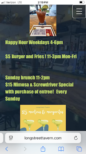 Read moreI donât usually go out of my way to leave reviews, but this little restaurant/pub blew it out of the water for us. Was looking for a new place to bring my parents whoâve lived here for 35+ years, but my mom is a new amputee. I called last minute to ask if they could accommodate. The owner who quickly introduced herself as Josie, said come on down, weâll figure it out. My mom is a little shy since this is new and I didnât want to make a big deal of it. We got there and a suitcase ramp is already in the door, waiting for us! I canât tell you how relieved I was. Mom smiled from beginning to end. The bartender/waitress was friendly, attentive, and cheery. The 4 of us all ended up with burgers and my dad (the hardest to please), thought it was absolutely delicious. $10 bucks for a delicious, SIZABLE cheddar burger with the works, and fries. Canât beat that! Mom had one of their signature cocktails (a Peanut Butter White Russian I believe) and commented how good it was and good thing she didnât have to drive! đ Small town feel with high class service. Thank you, Longstreet Tavern. We found...