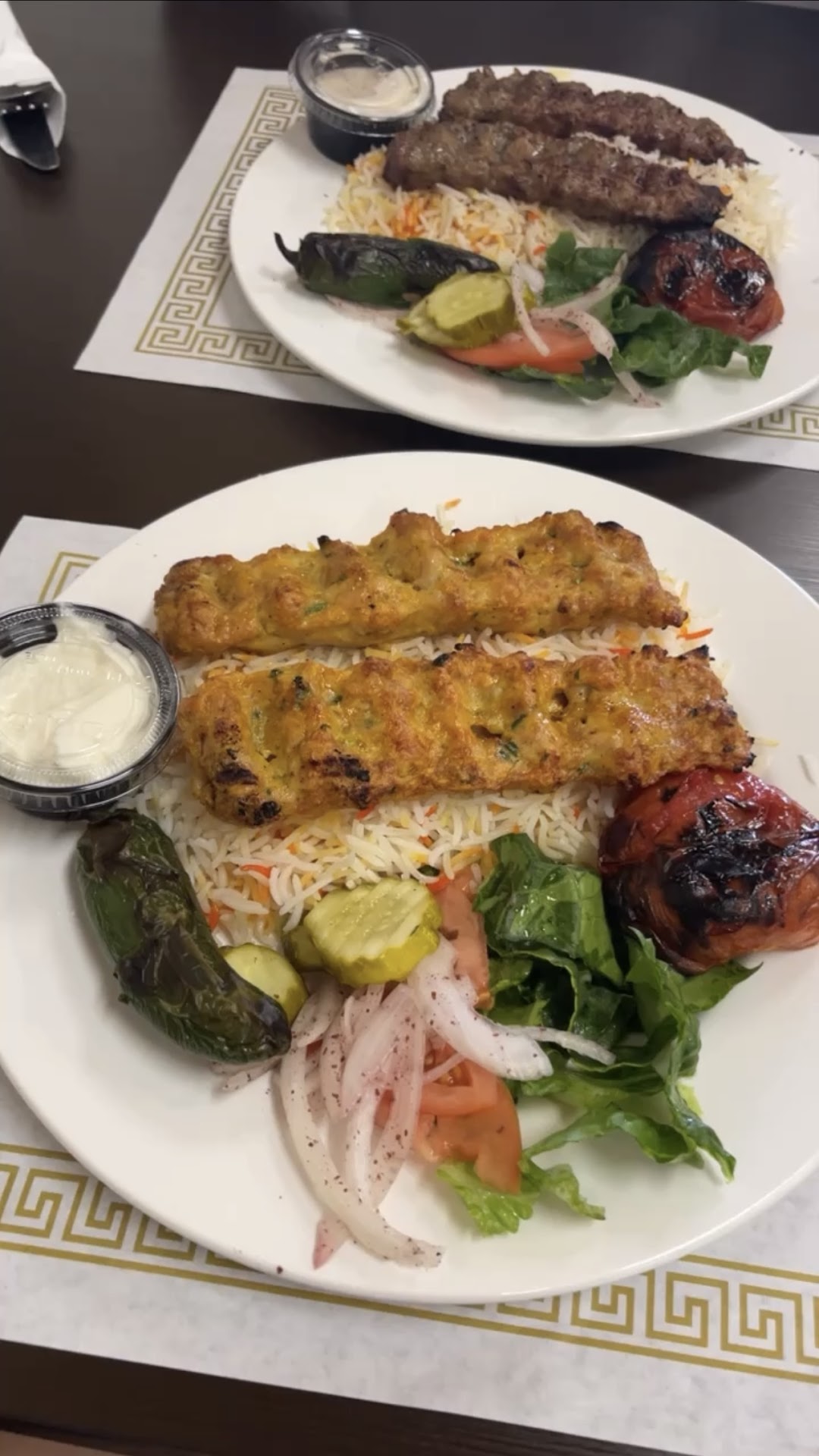 Mixed Grill Family Platter (Serves 4). A heaping Platter of grilled meat! Chicken & Beef Shawarma (Wonderful flavor), Ground Chicken Kabob (Well seasoned), Kefta (Beef) Kabob (Well seasoned). Garnished with Grilled Tomatoes and Onions over seasoned Basmati Rice. Served with frsh Pitas, Taziki, Tahini, Garlic Aoli Sauce(sooooooo gooood!!!)