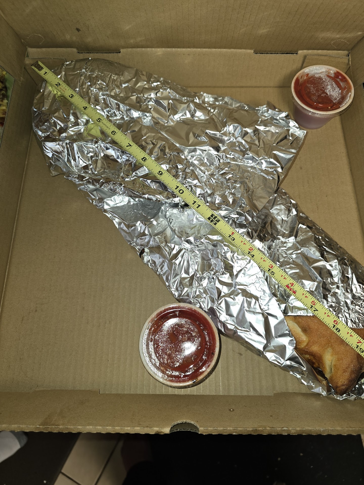 Now, about that whole calzone thing... Everybody here has shown pics and said "it's as long as my arm" Well, trust but verify.. you can see by the tape measure in the photo, that the calzone measures 19 inches or so from tip to tip. It's packed full to bursting with mozzarella and/or ricotta cheese, and a ton of pepperoni (That's how I ordered it). Between the two boxes, it weighed about as much as a small child, lol. AND tasted amazing. Total cost for both items into less than 40 bucks, And it could easily have fed 10 people.