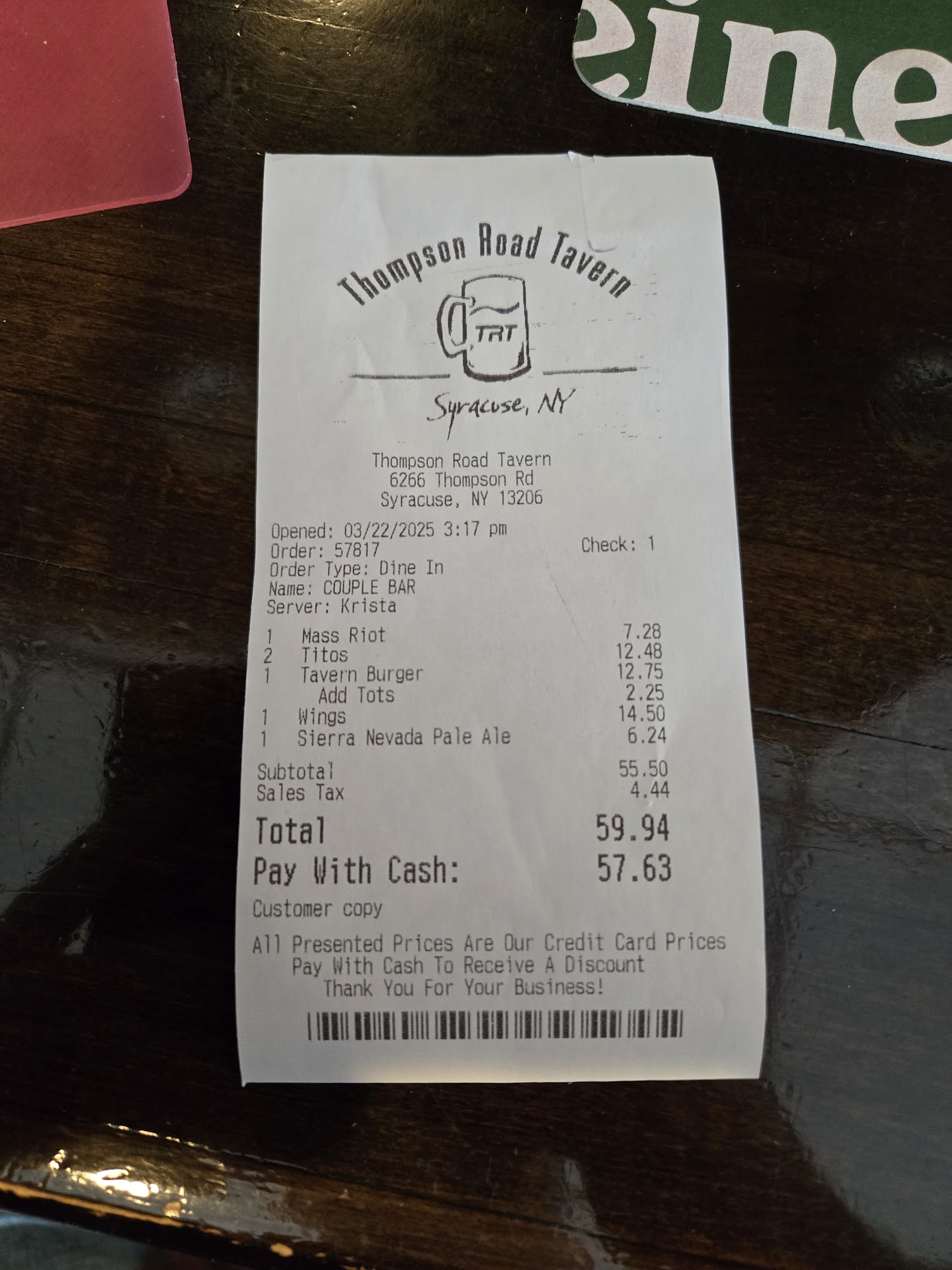 Read moreThompson Road Tavern has the typical bar/tavern atmosphere. The food is delicious. The parking is sparse. The vibe is happening on a sports game day. They have lots of beer on tap. Chicken wings are crispy and flavorful. The chopped cheese sandwich was a little soggy and I had to eat it with a fork but the flavor was there. Burgers are cooked to order and the chef does a fine job with consistency in food portions and temperature. It is a great little food spot to watch the game and socialize with people. There is a lottery machine as well as Quick...