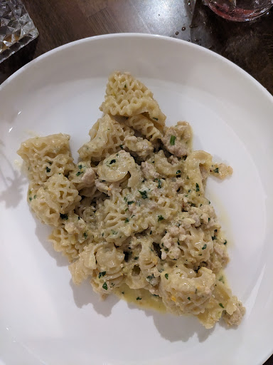Tough to choose between the well-crafted cocktails and the feeling that wine is a lovely accompaniment to these pastas. Only solution is to start with a cocktail and then get some wine. The Curious Wonder is what I'd call a Mexican Vesper, with tequila and mezcal swapping in for the vodka and gin, and it works nicely as an aperitivo (personally I'd serve it up instead of on the rocks, but that's an inconsequential quibble). The "Kungfu" Malbec was solid, though it would be great to see one or two more adventurous options on the wine list. The liquor shelf, though, is very well stocked with interesting selections, so I'd recommend sitting at the bar if you want to explore.