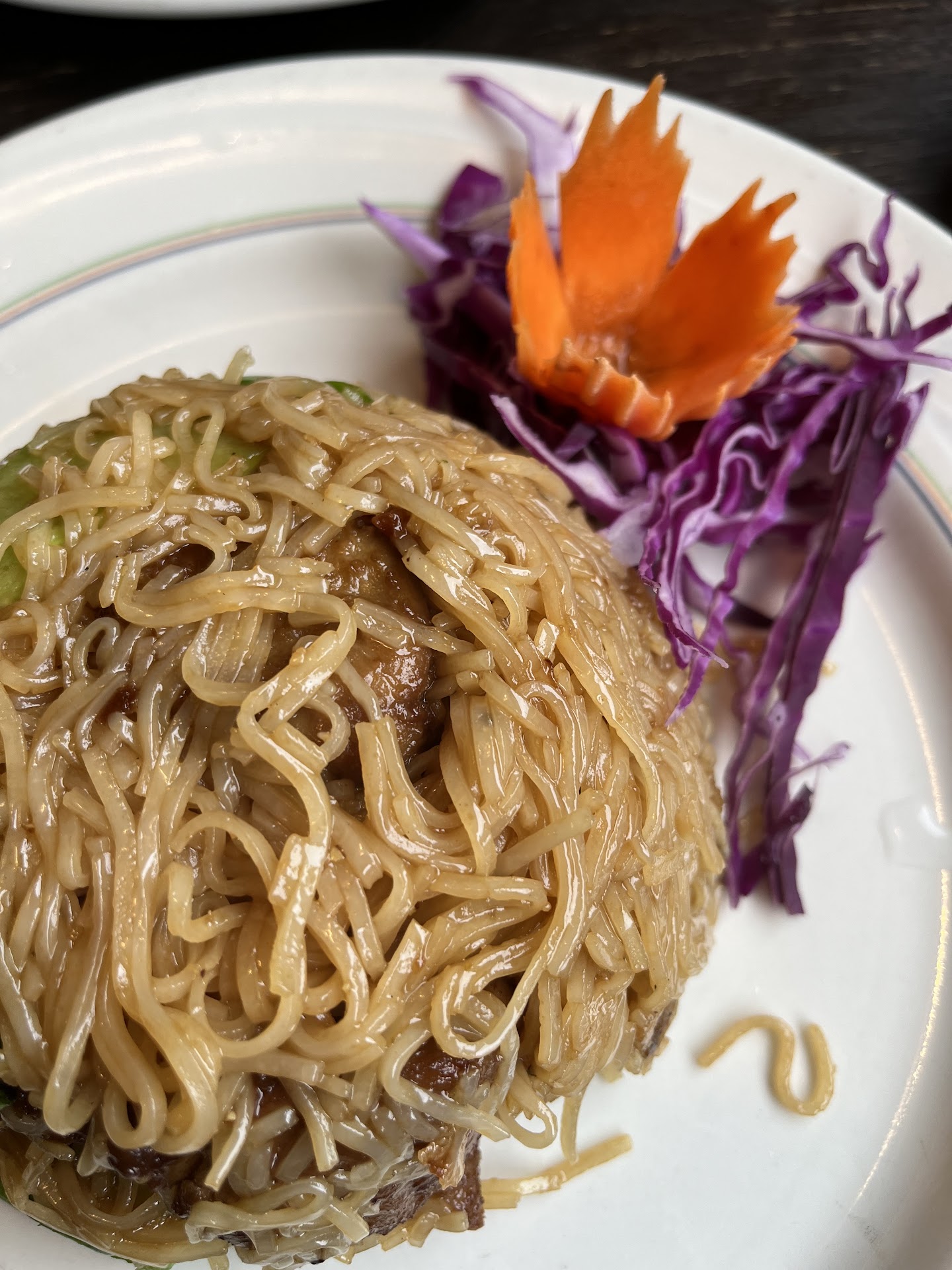 Pad Se Ew with Mock Duck: DELICIOUS! The waiter informed us that they were out of the wide style noodles so we used the thin noodles instead- just as great! It came out beautifully presented. The portion was large & filling. The sauce was perfect. The mock meat was perfectly cooked - tad on the crispy side, but still tender & juicy on the inside. The entire dish was really good. Loved the sauce & mock meat.