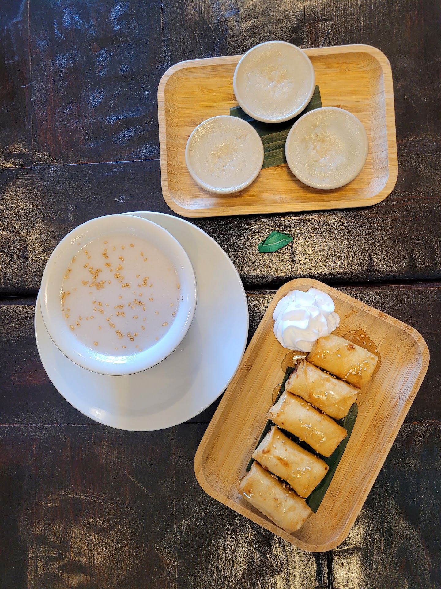 Make sure you don't sleep on the amazing desserts!! We had the fried bananas, coconut dessert, and taro pearls in coconut cream. The fried bananas were fresh and flaky with maximum banana flavor and perfectly accompanied with syrup and coconut cream. The coconut dessert was delightfully surprising in texture and had a subtle sweetness that was perfectly offset by a very slightly savory top. It is my sister's new life goal to recreate this dessert she loved it so much! The taro pearls in coconut cream was warm, light, and sweet in a lovely cozy way. The taro pearls themselves had a great texture and flavor and were handmade. The toasted sesame seeds on top was truly the perfect addition for a little bit of crunch.