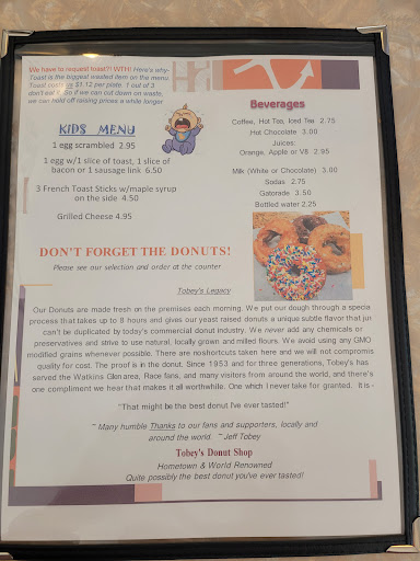 During a recent trip to the Finger Lakes with friends for the first time, we finished an amazing get away visiting the region by stopping at Tobey's on the way out of town. When we first arrived to Watkins Glen we noticed a donut shop with a sign that said "Sold Out" and immediately said to each other, we have got to try that out as this had to be a good sign. We did not let long lines out the door deter us from trying what we assumed was amazing food that so many people were waiting for. After putting in our order for 2 breakfast sandwiches and 2 donuts, we waiting in very small crowded space for our sandwiches to be made. This was very chaotic and crammed as there was a great deal of confusion about who was in line to order vs. waiting for food vs. waiting to be seated. The layout of the place is very unorganized and needs a lot of help to avoid this mess. We were pushed from spot to spot in order to get out of the customers way as well as waitresses trying to get coffee from the coffee station and coming out of the kitchen for hot food. It would not have been a big deal making this work however after 25 minutes of waiting for two egg sandwiches, it made the experience a bit more painful. After over 30 minutes of waiting for our two breakfast sandwiches, we were handed a bag which included 1 sandwich. We attempted to make our way to the front to let them know we were missing a sandwich which was impossible to do due to the crowds of people ordering and waiting for their meals. Upon opening the one sandwich we had, we noticed that even after 30 minutes or waiting, our sandwich looked like a toddler made it as the english muffin was cold and not toasted and there were a few pieces of shredded cheese thrown on top that were cold and not melted. After trying to get someone's attention from the kitchen for a few more minutes, we decided to call it quits, count our losses, and move on down the road to Dunkin. I always like to support local businesses when traveling and not chains however in this case we will not be back and am a bit puzzled by the long lines and hype. This place needs some major help in management and product excellence. Look elsewhere for breakfast options when near...