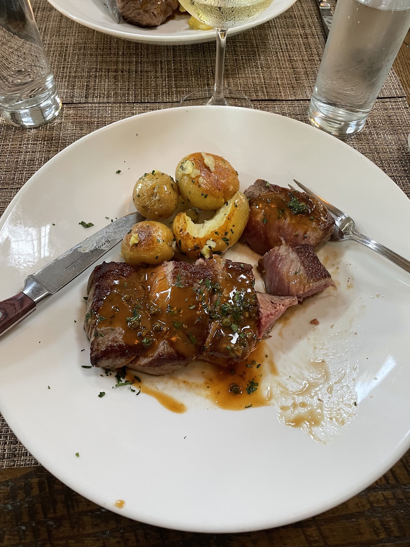 when the steak arrived my friend and i were shocked!!! we honestly were starving and didnât want to be those people that sent back steaks but genuinely have never eaten a worse steak. it was described as Painted Hills Strip, creamy tellicherry pepper sauce, crushed potatoes what we got was a grey steak, cut SO thick, with a gelatinous sauce (pls refer to pics to laugh bc how could that be described as CREAMY) and whole unsalted bland potatoes described as âcrushedâ one potato had an entire chunk missing. it also had capers on it?? for $52 iâve had better steaks at chilis. at one point i said, im so hungry but i cannot finish this.