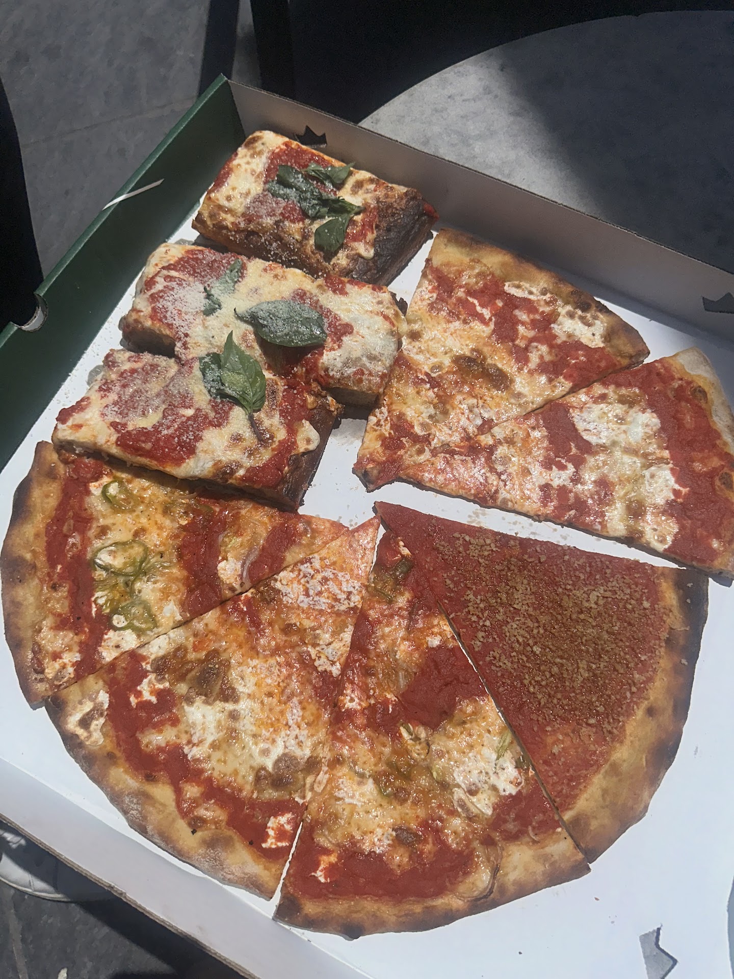 Read moreFini Pizza is a great local pizza spot. Its pizza is unique, creative, and uses great quality ingredients. The crust is what makes this pizza unique. It’s super thin crust, but a bit dense instead of your typical light and airy crust. It soaks up the olive oil nicely and is crispy. The white slice, what brought us here after my wife heard a local rave about it on social media. Topped with lemon zest and served with a slice of lemon, it’s rich, bright, and flavorful. I think it could be taken to an even higher level with maybe just a touch of fresh basil or Italian parsley perhaps? Cheese slice is solid as well, great undercarriage and good amount of sauce to cheese ratio. The “grandma” slice looked more of a Sicilian to me, a lot thicker than your typical grandma. But nevertheless, it was delicious, and the sauce was very fresh with chunks of fresh tomato and a little spicy, which I didn’t expect. Great pizza split with friendly staff, and a nice dining area connected, or benches to enjoy outside...