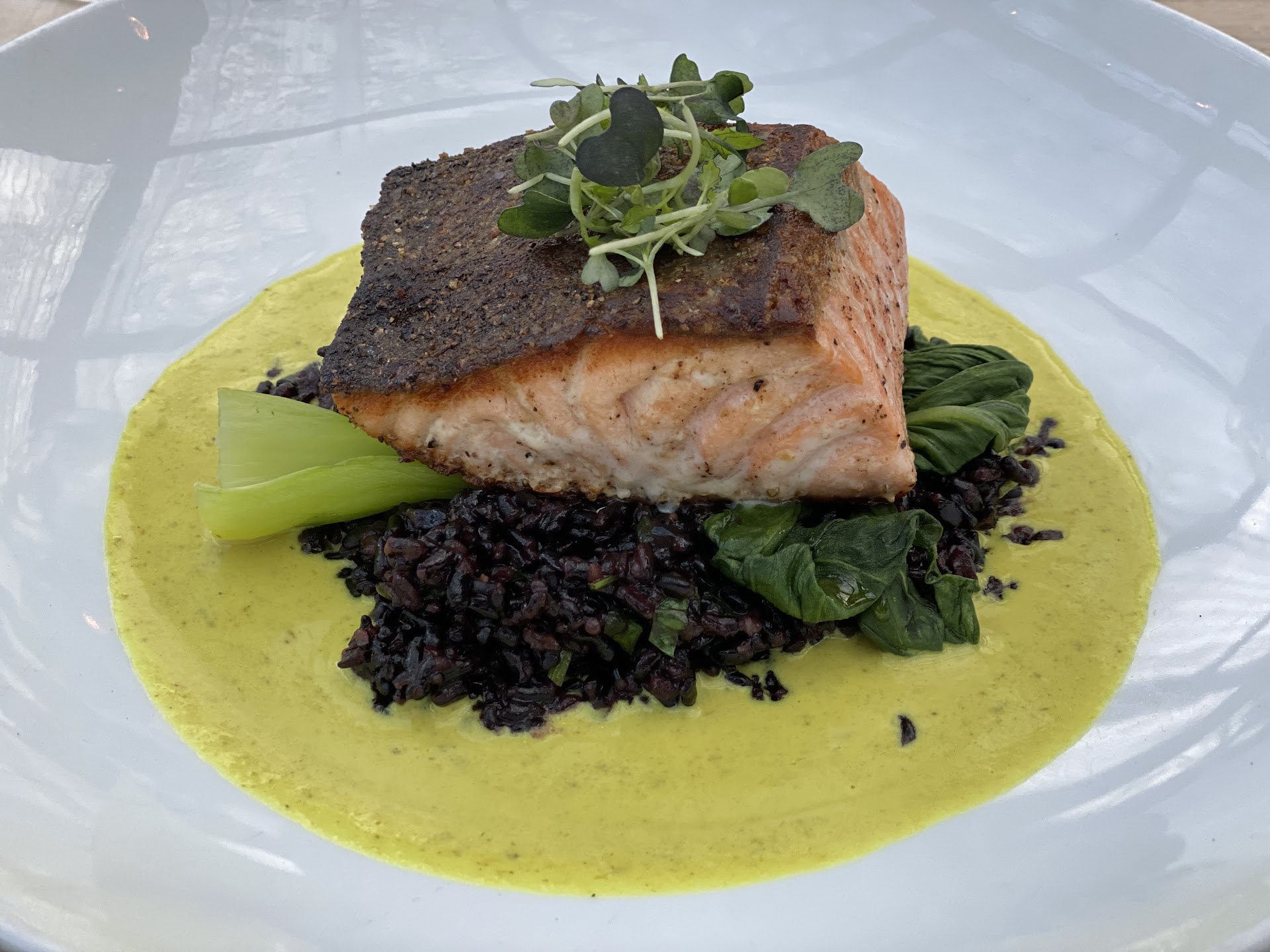 We then ordered two glasses of red wine to have with our main dishes, (one of which we were waiting on since it was undercooked) but the wine never arrived which was a little confusing because the restaurant was pretty quiet since we took a late reservation. The salmon I ordered was okay at best, but felt under seasoned and uninspired. Our seasonal peach salad had peaches that were not ripe which was disappointing as the focal point of the dish.