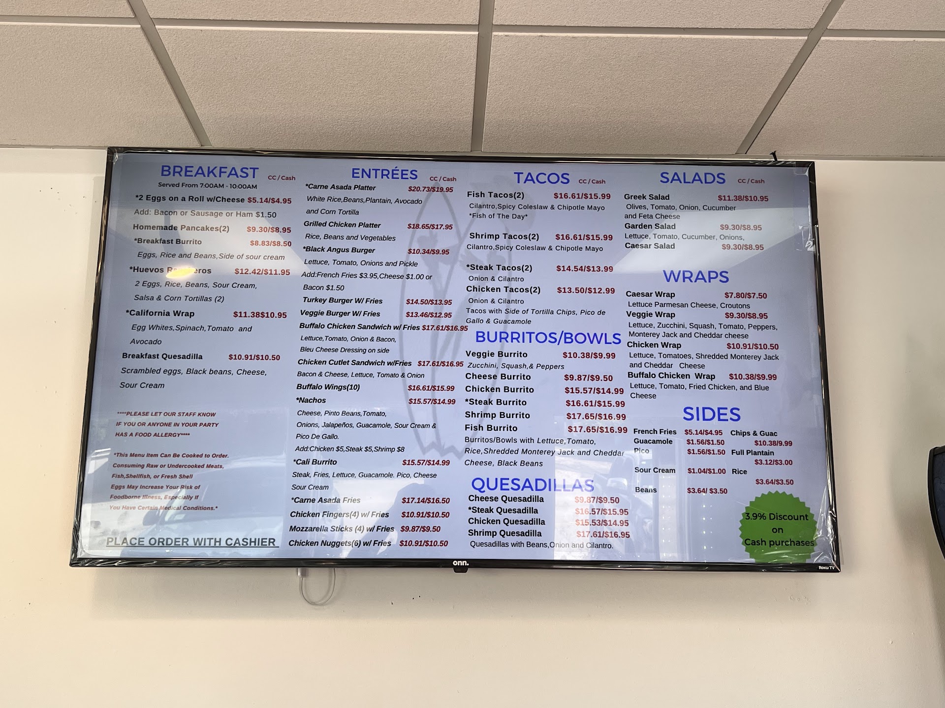 Walked in thinking this was going to be a great restaurant according to Google reviews. However, my group and I encountered issues with the service and food. The lady at the cashier was unable to comprehend simple requests such as putting sour cream on the side for my burrito, instead of inside it. Another red flag experienced was the up pricing of their food. A cheese burrito was listed as $10.38 (credit) on their menu, however the lady managed to ring up the price to $16.94 with no additions or extras. After bringing that up to the cashier lady, she changed the price to $10.86 not including tax. If you're going to have the listed prices enlarged on a board, you should not be secretly charging your customers more. Once we were given our food, I saw that the no sour cream was given. I kindly go back into the restaurant to request sour cream on the side. The lady tells me it's in the burrito as if she made it and that if I want more it'll be $2. On the large menu printed on the wall, it said a side of sour cream was $1.04 (credit). Wild to see another instance of up charging. After eating half of the burrito, it was clear that none was put in and I kindly go back to the lady to show her. She goes to the kitchen to bring me a side of sour cream and she angrily tells me "ok bye". The service was poor and the burrito was nothing special with majority of it being lettuce and cold bland white rice with little to no beans. I recommend you put your money somewhere else in this town where you can receive better service and honesty about what you're paying for. I would give this a 0/5 stars...