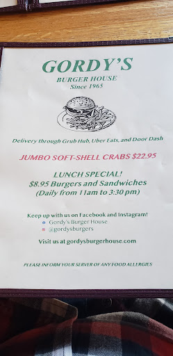 Read moreI went to Gordy's for lunch on a Saturday afternoon. My brother was up from Brooklyn and wanted a burger so we decided to try this place. For a restaurant called Gordy's Burger House, I'd think there would be more burger selections or at least have a few more topping options to go on the burger. To be honest, it was a little hard to find where the burger was listed. I would have thought the burger would be the first option on the menu or at least have a section called build your burger and have a list of toppings, cheeses and sauces that can be added. I ordered the cheeseburger with American cheese (there were only 4 cheeses to choose from). When the burger came, that's all it was. The usual lettuce, tomato and onions wasn't on the side. Fries were included but I opted for sweet potato fries for $1 more. The burger itself was seasoned and very good. Fries were good also. I would have liked the additional toppings though. There are 2 doors, the left side door is the bar and the right side is the restaurant. We went to both sides before a waitress found us looking around to seat us. The restaurant looks a bit outdated. The best part of the restaurant was probably the TVs in every single both and you get your own remote. Perhaps the dinner experience is a little better. I would go back for dinner to check...
