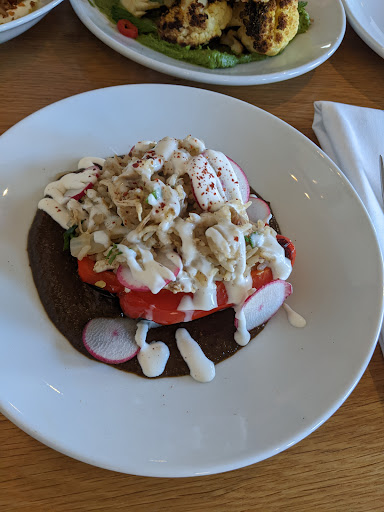 I wish there were half star ratings because I would have given this place 3.5. the atmosphere was nice, very clean, the only complaint is that it was very cold inside and the table they sat us at had cold air blowing directly on it from a vent. My friend complained and the waitress said they would turn it off which was very nice. The table was quite small and would not hold all the dishes we ordered so we had to move to a larger table. Right away I noticed there were no salt and pepper shakers on the table (which I always interpret as a display of arrogance by the chef). We started with the focaccia with whipped ricotta, the focaccia was outstanding, the best I've ever had. The inside was super soft and stretchy, with a nice crisp buttery crust. If I could give it 10 stars I would. Amazing texture and flavor. The whipped ricotta had a nice creamy texture with a decent amount of black pepper on it , which I would imagine some people may not like. We also got the hummus appetizer, that was also really great, the hummus was very creamy and flavorful, the crispy chickpeas on top added some crunch and also had a nice flavor. We tried the chicken and rice stuffed pepper and we both enjoyed that as well..nice flavor profile with the coffee mole, chicken was tender. My friend ordered the cauliflower appetizer which he said was good but had some extremely hot peppers in it. I had the crispy potato dish and I thought it was good but nothing to write home about. (That's when I wished they had a salt shaker on the table) The dish that we were both most excited for and both disappointed by were the carrots, they were served cold. We were not expecting that...the texture of the carrots was good, they were soft and browned but serving them cold was completely unappealing. I was also expecting to taste the cardamom but it was overpowered by some type of vinegar flavor which I couldn't place because there was nothing with vinegar in the dish. The only thing I can guess is the tamarind and apricot juices mixed together may have given it that acidic flavor. The service was great, the food came out extremely fast, although when our first dish was brought the waitress forgot to give us plates and we had to wait a few minutes for another waitress to notice and bring some plates over so we could begin eating. Overall it was good but nothing to rave about, we both agreed it was not something we would go back for, although if I lived in the area I would absolutely order that...