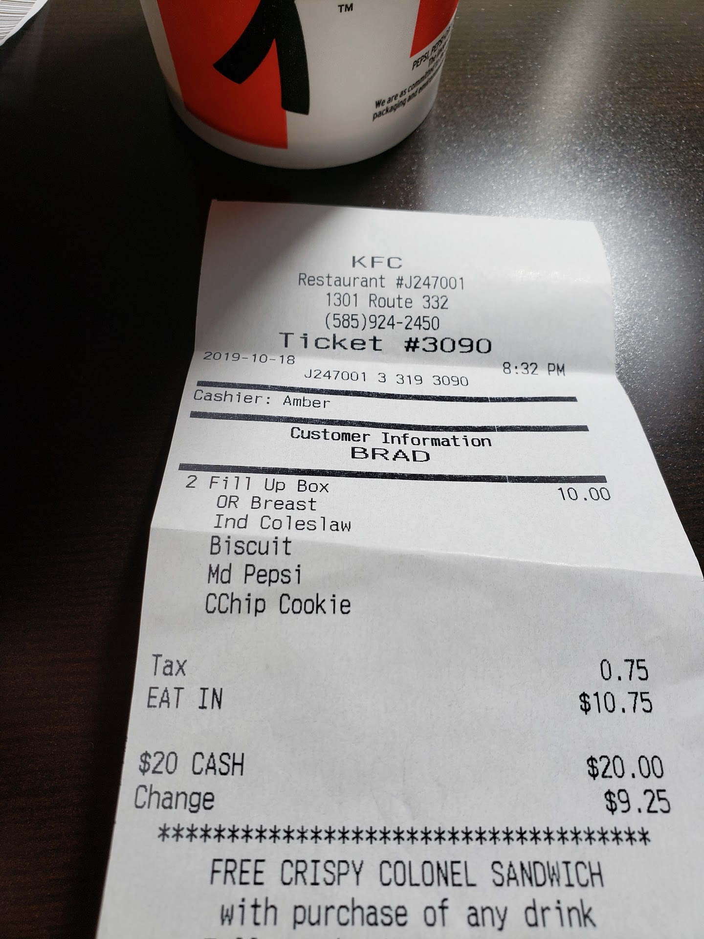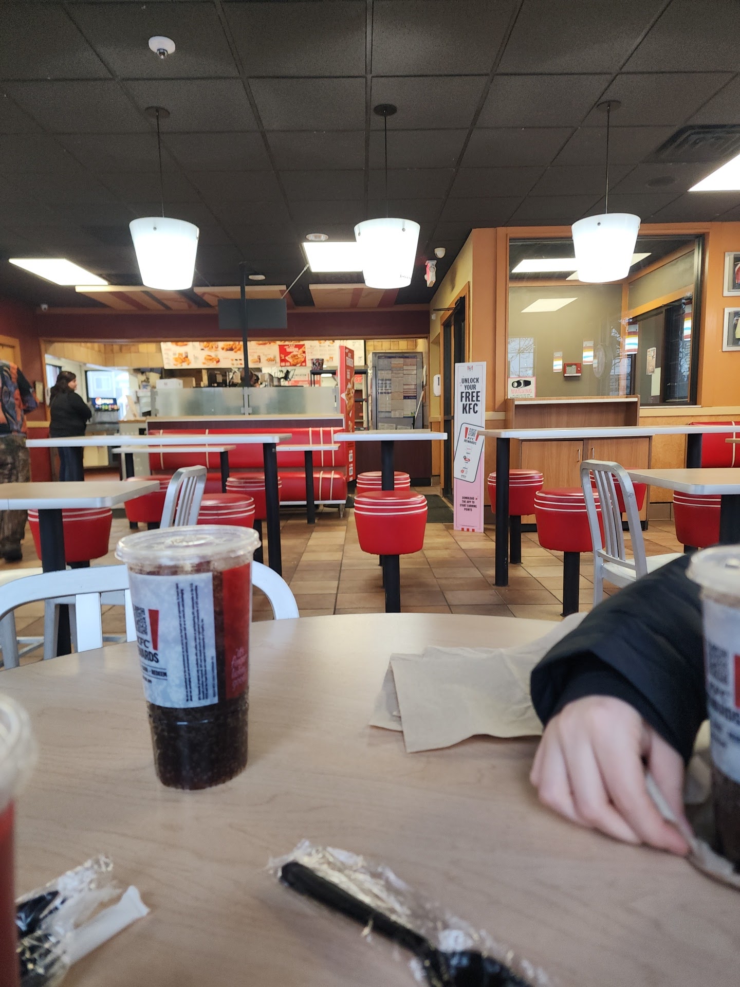 Read moreBeen to this one plenty of times since its near work. First time i got a 3piece chicken tenders box, and they gave me two and a half- the third was literally torn in half with one half missing. Second time, the gravy on my potatoes was lukewarm and had a gross jelly-like consistency while the potatoes were molten hot, third time they didn't have any buns for the doublicious (how do you run out of buns?) and they skimped out on the chicken bites cup my boyfriend got- the cup was only 1/3 full, literally with only 3 bites. my macaroni was also a little cold, and was overall unpleasant. fourth, gravy was gross again and they charged me for cookies i ordered and didn't give them to me. overall the food here is eh and nothing compared to how great most kfc food is, and the service is fairly poor. i'm sadly going to stick to the mcdonalds nearby instead, because they're at least reliable...
