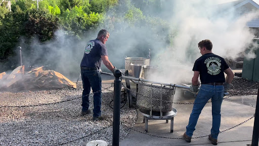 Now a fish boil is exactly what it sounds like: a bunch of fresh caught Lake Michigan white fish are cleaned and cut up, then dumped into a giant kettle full of boiling water, as it's sitting on a wood fire outdoors. But before the fish are placed in the kettle, whole onions and potatoes are dumped in first due to their longer cooking time. The night I was there, they also were boiling corn on the cob! The only seasoning used is salt, and when the meal is served, melted butter.