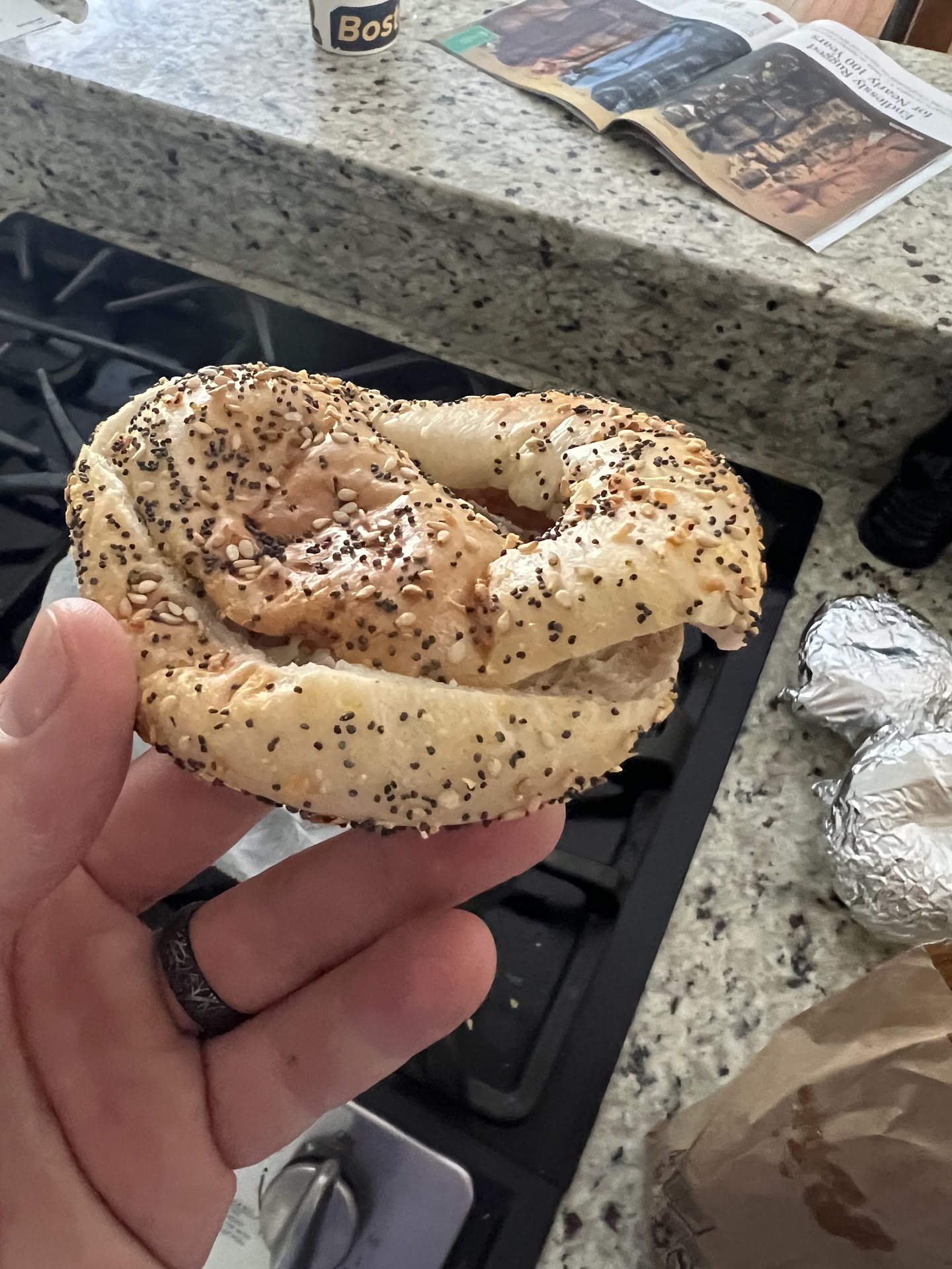 Read moreI got Manhattan bagels today and I ordered an everything bagel with cream cheese and my partner got an egg breakfast sandwich. My bagel didn't have any everything bagel seasoning on it, and it looked mostly like sesame seeds. The bagel tasted like a cheap bagel you would get at a grocery store. The cream cheese didn't taste quite right, I will say they are very generous with the amount of cream cheese put on the bagel. I didn't want to make this post but it wasn't just the taste of my meal that was an issue since eating my bagel my stomach has been messed up all day and I am not the only one my partner is having the same issue even though we got different meals. I don't know if we got a bad batch of food but this has left a bad taste in my mouth and I would recommend people not to go here to avoid the stomach pain that I have...