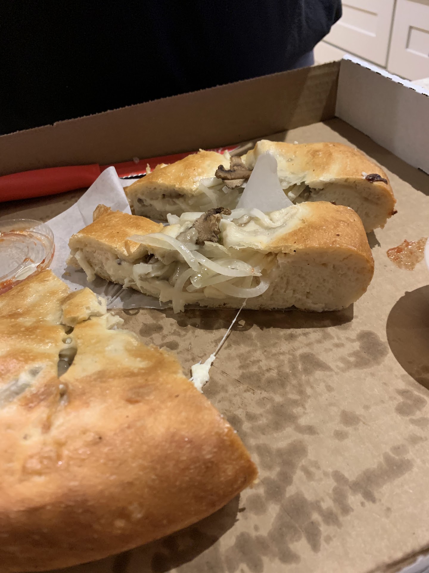 When I got home and opened it all up I immediately sampled the fried mushrooms, and like a can of Pringles, I could not stop. I stood there in my kitchen, still in my monkey suit, just chowing down on those mushrooms without a care in the world. I might have been a little hungry, but those mushrooms were excellent. And speaking of excellent, that RRP Chicken Pizza, woozier! Some pizzas just feel like the components are laying on top of each other, like they are repelling one another, but this pizza, this pizza was hugging itself. The roasted red peppers were as if they homogenized with the cheese, the cheese fused with the bread, the bread had a crispy exterior with a firm build. Every bite had zero toppings or cheese falling off, no mess, all happy. Sadly the salad was found lacking, a bit sour, that Italian dressing was the wrong call for the greens included.