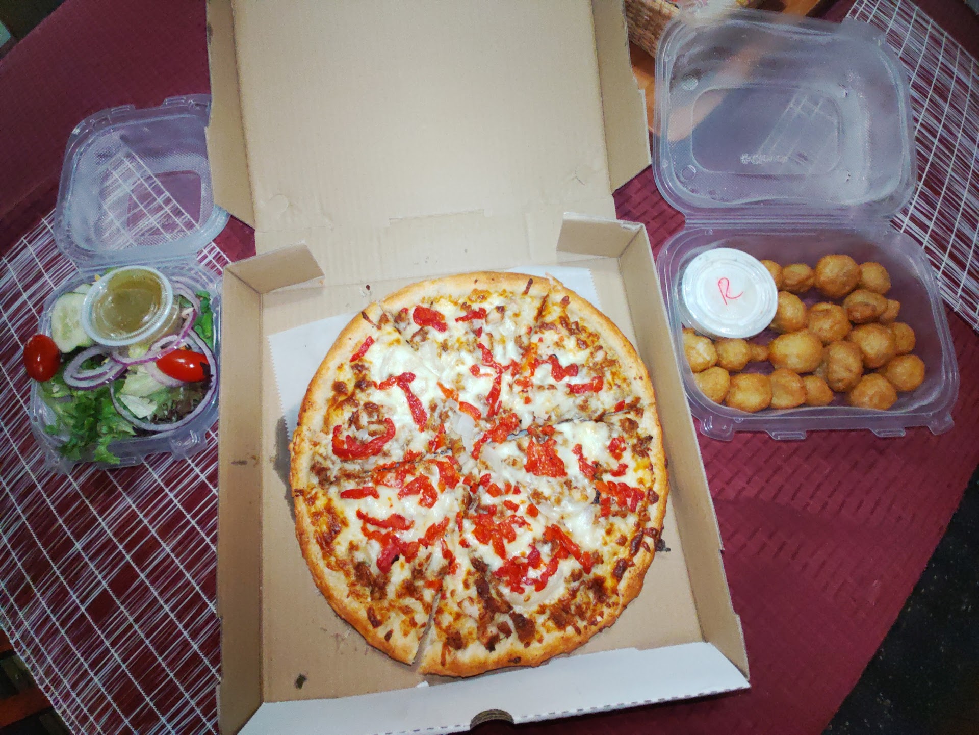 Ordered ahead over the phone with no problems, putting in for some Fried Mushrooms, a small Tossed Salad, and a 6 slice RRP Chicken Pizza.
