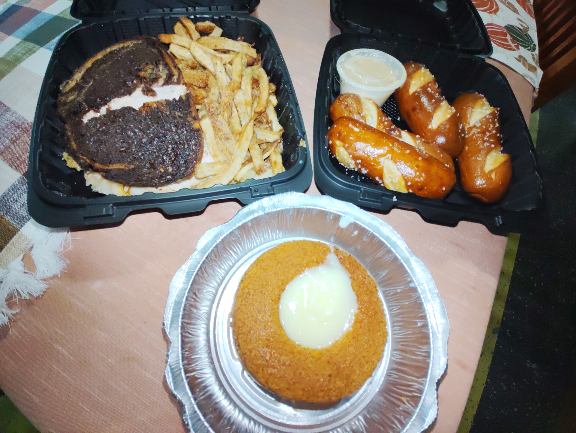 Ordered ahead of time over the phone for a pickup a few hours later, going with the Bavarian Pretzel Sticks, a Turkey Ruben Panini, and the Pumpkin Lava Cake.
