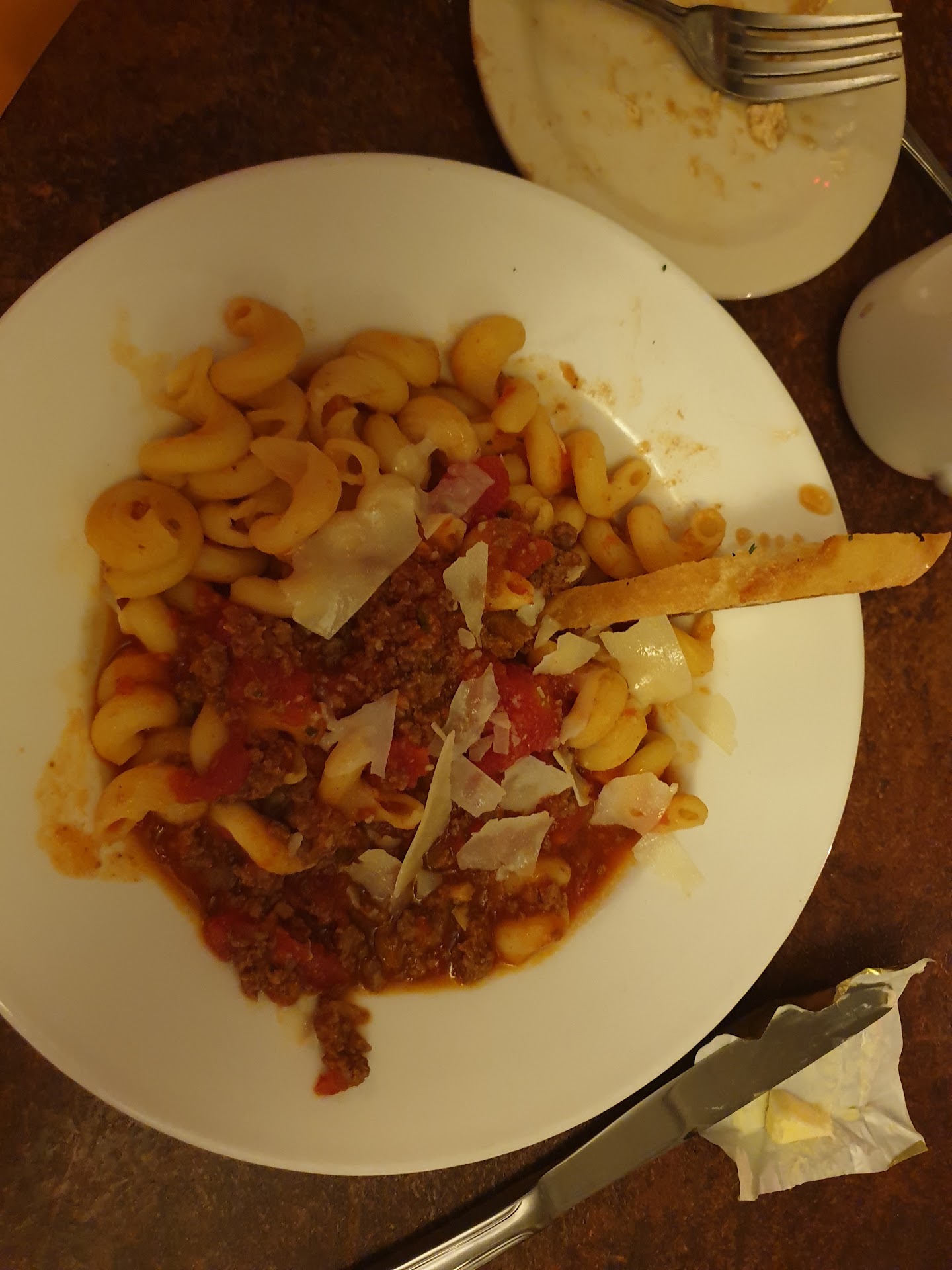 This place seems like its trying to tout itself as being a higher-end restaurant, but its not. Besides the service and uncomfortable atmosphere, one of our bread plates was questionably dirty and the food took a long time to come to us. This restaurant has one of the worst and unremarkable menus I’ve encountered; it made picking something from their unimpressive entrée list a bit challenging for me, but I went for something simple – the pasta Bolognese, and my fiancé the braised beef short ribs.