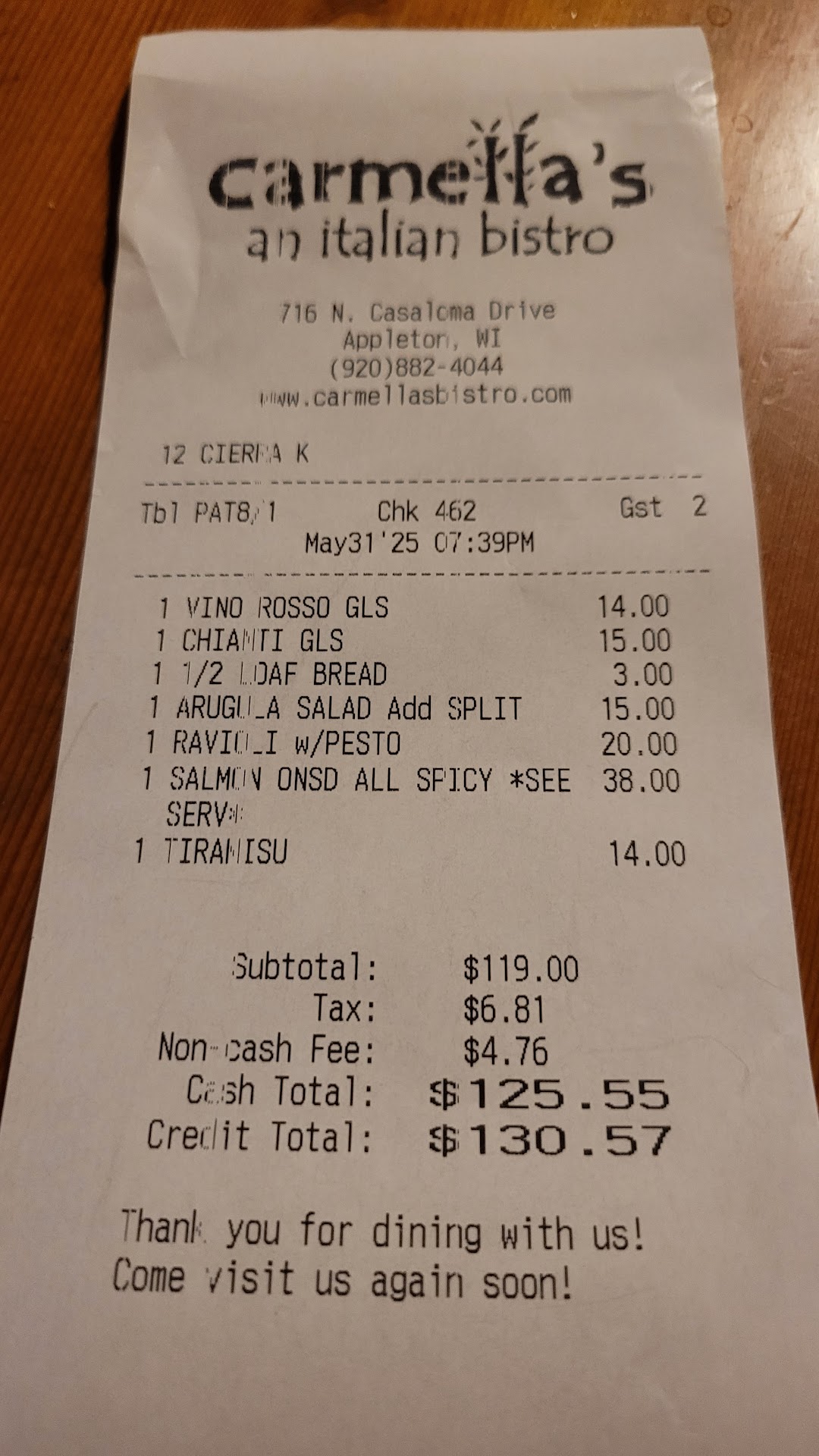 Read moreExceeded my expectations. Passing through Appleton and wanted some Italian but not your Olive Garden fair something nicer. Saw Carmella's here on google with high reviews. Arrived with my mother who has some mobility challenges. I left the car with flashers on in fronts and walked her in to be greeted by the hostess who asked if I wanted to sit outside on their back patio or inside. When I said outside they suggested I drive around back to make things easier which was very thoughtful. The menu was a bit more expensive than I would have expected in the Appleton area. Though everything looks well thought out on the menu. We ordered two glasses of wine which were normal sized pores. Water pitcher on the table is convienient. I then had the arugula salad and the bread service. The salad will you split and they brought it out split in very large portions. Was delicious with the goat cheese dates and just the right amount of balsamuc. Bread was also excellent with vinegar and oil. I would have appreciated a little bit of salt on the side. For mains we had the salmon and the pesto ravioli. Both were spectacular. I don't know how they did the salmon. It was very flavorful and crunchy on the outside braised in some fashion. Wait staff was very attentive. Cierra was fun, hard working. Was nice to see them working as a team to clear plates and such. I found it interesting that they were playing 70s popular music not the cliche Italian. Was refreshing and fun. For dessert we had the tiramisu. Was encouraged to see it come out in a serving glass not on a plate. Though it could have used a little more espresso and amaretto. Please be advised they do charge 4% for a credit card, so bring some cash. Don't be afraid to go here because they are in a strip mall. It...