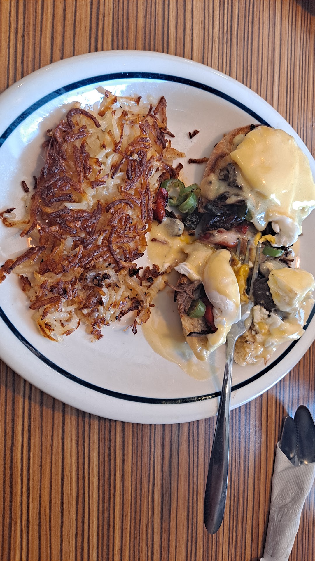 Read moreGood things first: eggs were done well, the spicy poblano eggs benedict was frankly quite good and I am sad I won't get to try them again... because everything else was from ok to bad. The restaurant was dirty and in considerable disrepair, the portions of the hashbrowns were kind of insulting given the price, the glasses and silverware were dirty, and the prices in general were a bit steep even before other considerations. There were damaged walls, ripped and damaged seats, the ceiling has stains and damage, and there were a lot of dirty patches and corners throughout. There were a few strange smells that occasionally showed up as well. I am a hashbrowns guy. Big time. I love the crispy outside and fluffy inside... so long as there is an inside. These hashbrowns were very thin and dry. The bacon was overcooked and seemed like it was probably microwaved. The coffee was watery and bitter. This was not what I had come to expect from IHOP, and there are all the signs that they were understaffed and that management (either local or corporate) has lost their grip on needs to be done. This was not a 1 star because the staff were trying and some of the food was tasty. But, we aren't...