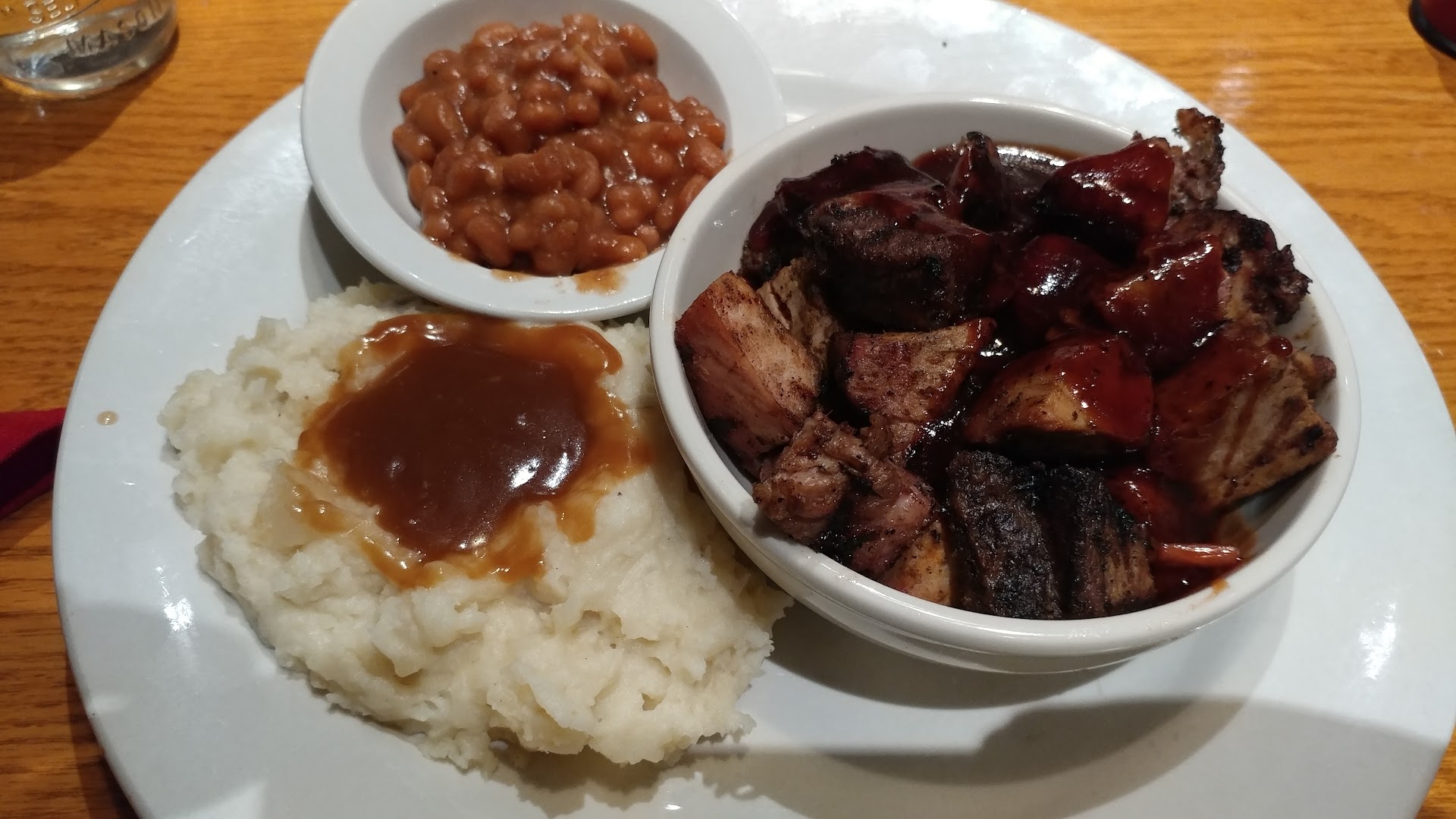 It’s not that the food we tried was awful. Far from it. But everything was bland and under-seasoned, especially the steak (which was just plain awful even though it was cooked perfectly to our desired temperature). The flavor of the meatloaf was adequate, but the huge (freakishly huge) portion of bland potatoes they pile atop it robs it of it’s flavor. They drizzled a small amount of beef gravy over the top of everything (the gravy was admittedly the best part of the entree, which is a little sad when you think about it). I had to scrape off the potatoes and ask for more gravy and that was better, but not great because after scraping off the potatoes I found a sad little thin slice of underwhelming meatloaf (no wonder they hide it under a mountain of potatoes). They serve their meatloaf and potatoes on a slice of sourdough bread, which sounded amazing but ended up being a non-factor due to the overall blandness of the food.