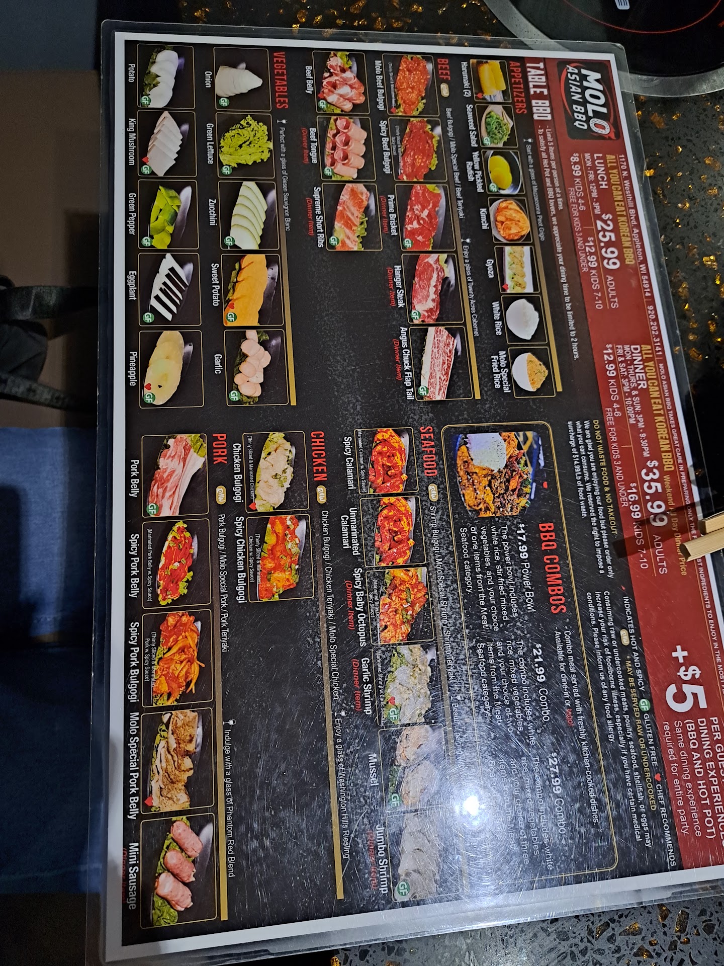 Read moreI love that we now have an ayce kbbq/hotpot in the fox cities! Iâm not a big fan of marinated meat but Moloâs so far is good. Iâve been there when soft opening happened and our server didnât come around to us as often. At that time, it was 5 orders per person and so me and my spouse ordered 10 total but when it came out, it was 1-2 slice of meat/seafood. Some of our orders were forgotten, like the appetizers (it didnât come until after we ate and paid plus it was cold when it was brought out). We had our 1 year old with us and had wanted a high chair but with the walkway space being so tight, it would be in the way of all customers so we had her sit in the booth with us. In this case, not very kids friendly. Our server at that time doesnât come often to take our next order so there was a bit of a wait on that. And there wasnât many side dishes offered. Their kimchi wasnât to my liking - more sweet. I thought the hotpot soup is bland. Only things we like out of our first time was the meat and the fact that it is an ayce. I think with the pricing, the menu variety isnât much. It was soft opening so we didnât have high expectations.